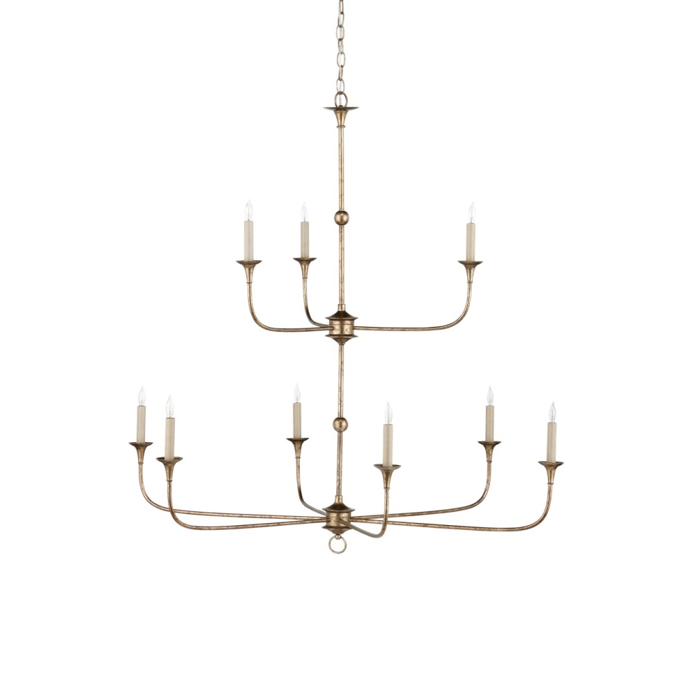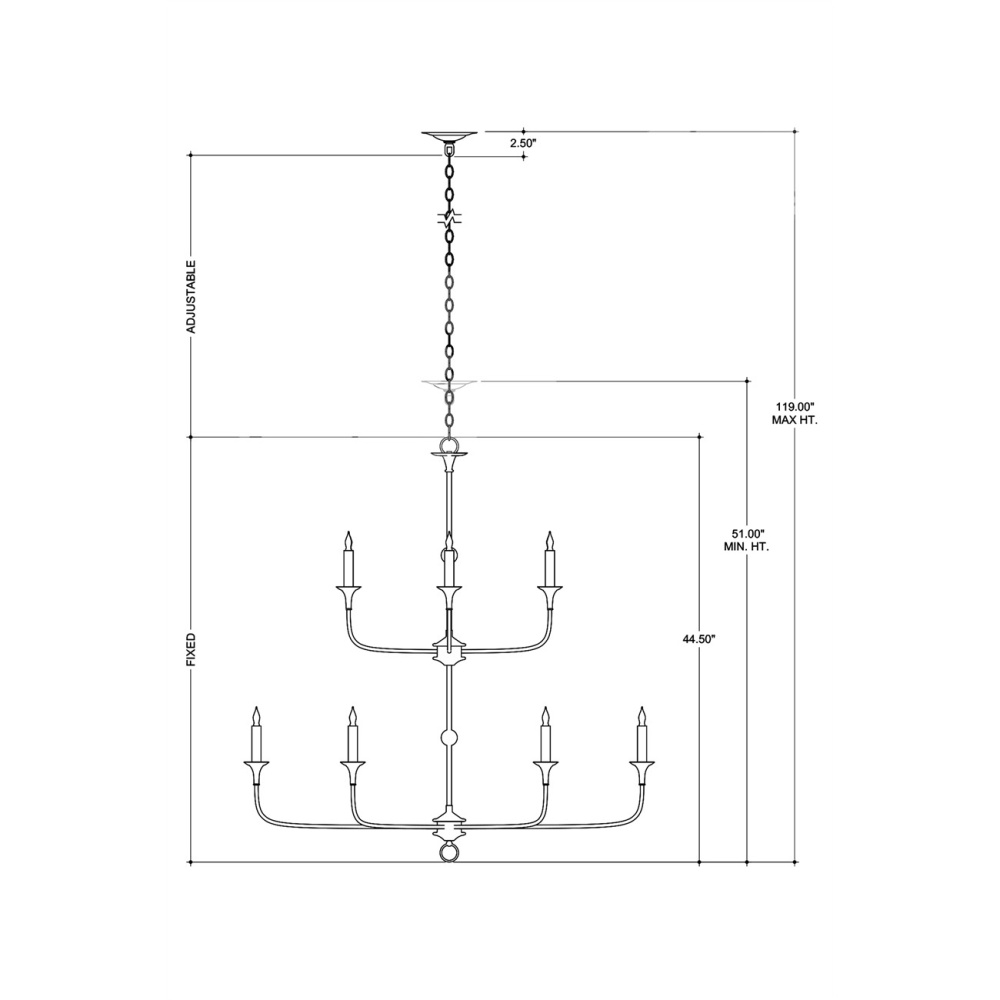 Design notes on the Nottaway Two-Tier Bronze Chandelier include long arms that stretch gracefully from small cogs and a ring that ornaments its bottom-most point. The profile of the fixture has a lovely fluidity to it, and the Pyrite bronze finish adds textural interest to the bronze chandelier. This statuesque chandelier is decidedly in the traditional design category, but its airiness allows it to function in a range of large rooms. Adjustable from 51" to 119" with use of included chain/rod kit/cable. If your space calls for a longer drop, additional chain/rods/cable is available for purchase.