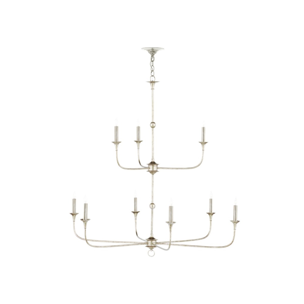 The arms of the Nottaway Two-Tier Champagne Chandelier stretch gracefully from petite cogs that rest at the bottoms of its stems, the bottom one ornamented with a dainty ring. Though the silver chandelier has minimalist lines, there is a sweeping fluidity to its profile that makes it a natural choice for large tall foyers or any room with high ceilings. The finish on the wrought iron frame brings textural interest to this dimmable nine-light fixture. Adjustable from 51" to 119" with use of included chain/rod kit/cable. If your space calls for a longer drop, additional chain/rods/cable is available for purchase.
