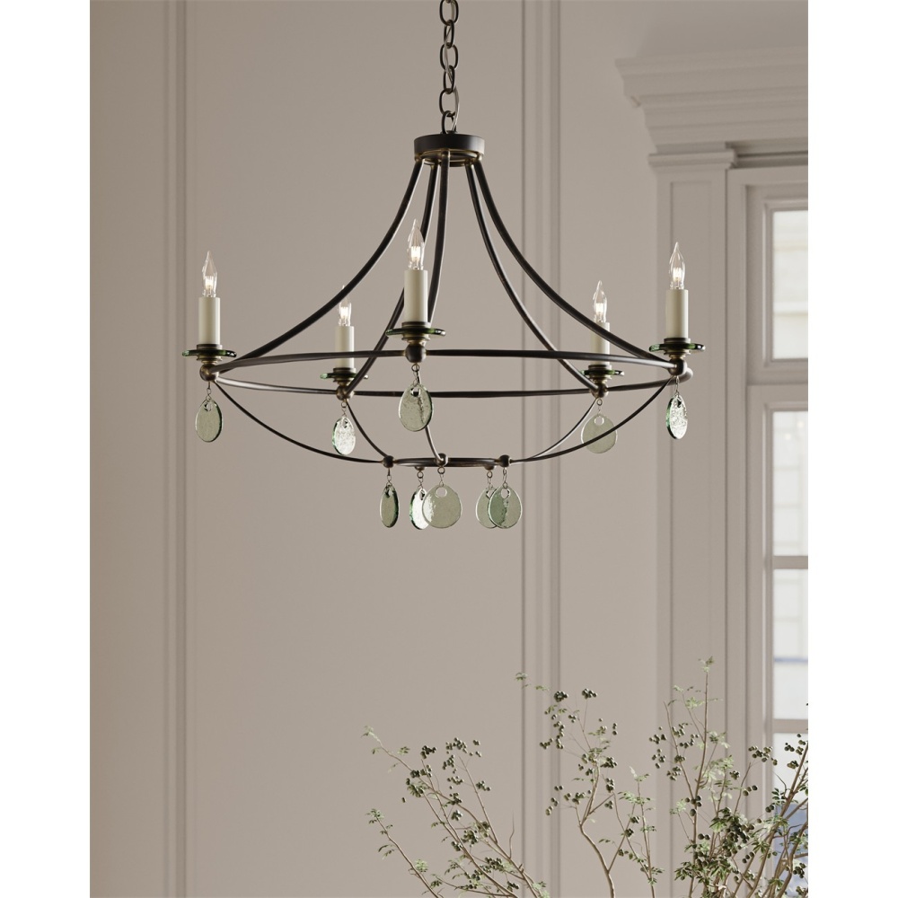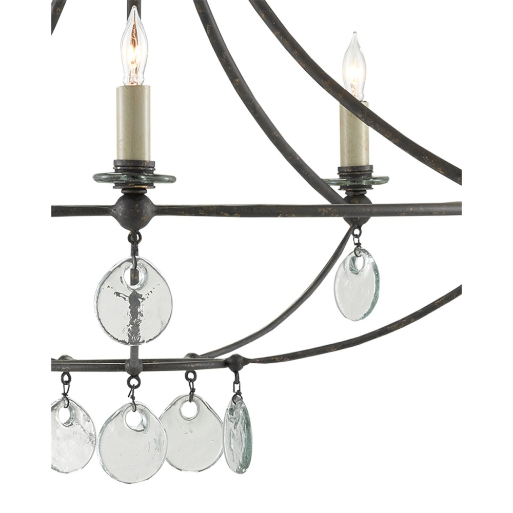 The Novella Small Chandelier showcases timeless craftsmanship and a creative use of materials. Recycled glass, which takes on a sheen when light strikes it, was used to create the bobeches and discs that adorn the black chandelier. The wrought iron frame in a Mayfair finish has an anchoring effect. Adjustable from 26.5" to 94.5" with use of included chain/rod kit/cable. If your space calls for a longer drop, additional chain/rods/cable is available for purchase.