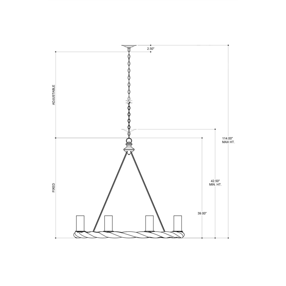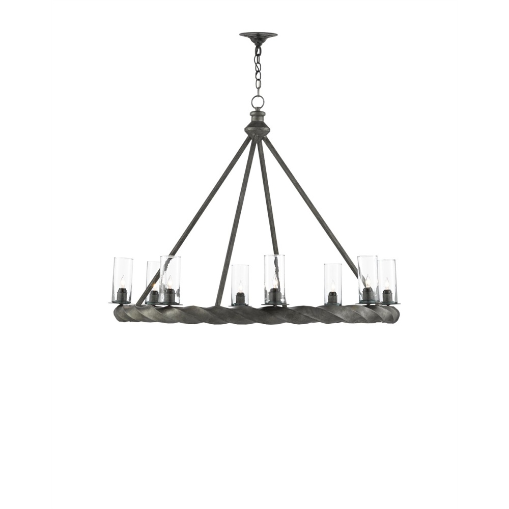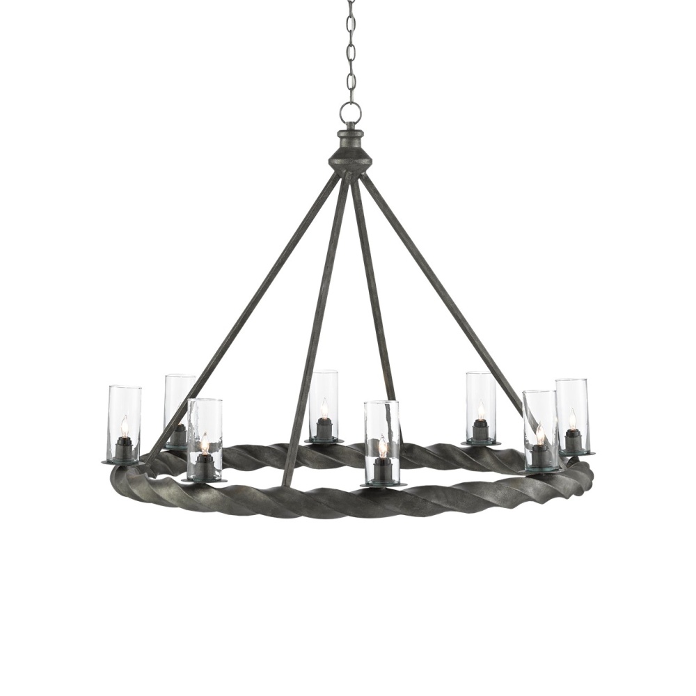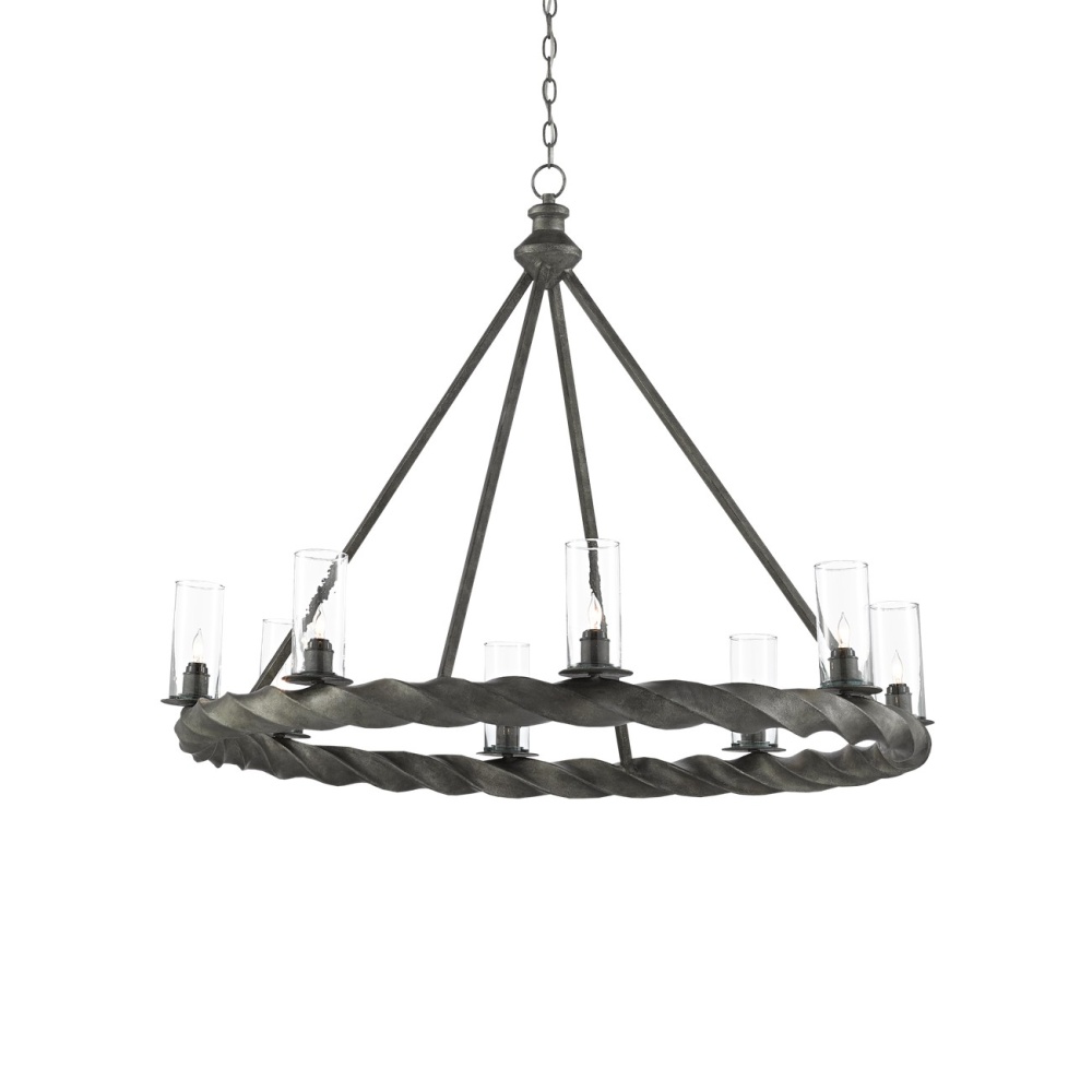 The traditional shape of the Orson Chandelier is cemented by a bottom ring in a rope motif made of wrought iron. The light Mole finish, the patina, and the clear glass canisters are design notes that bring this black chandelier a handsome profile. Adjustable from 45.5" to 113.5" with use of included chain/rod kit/cable. If your space calls for a longer drop, additional chain/rods/cable is available for purchase.