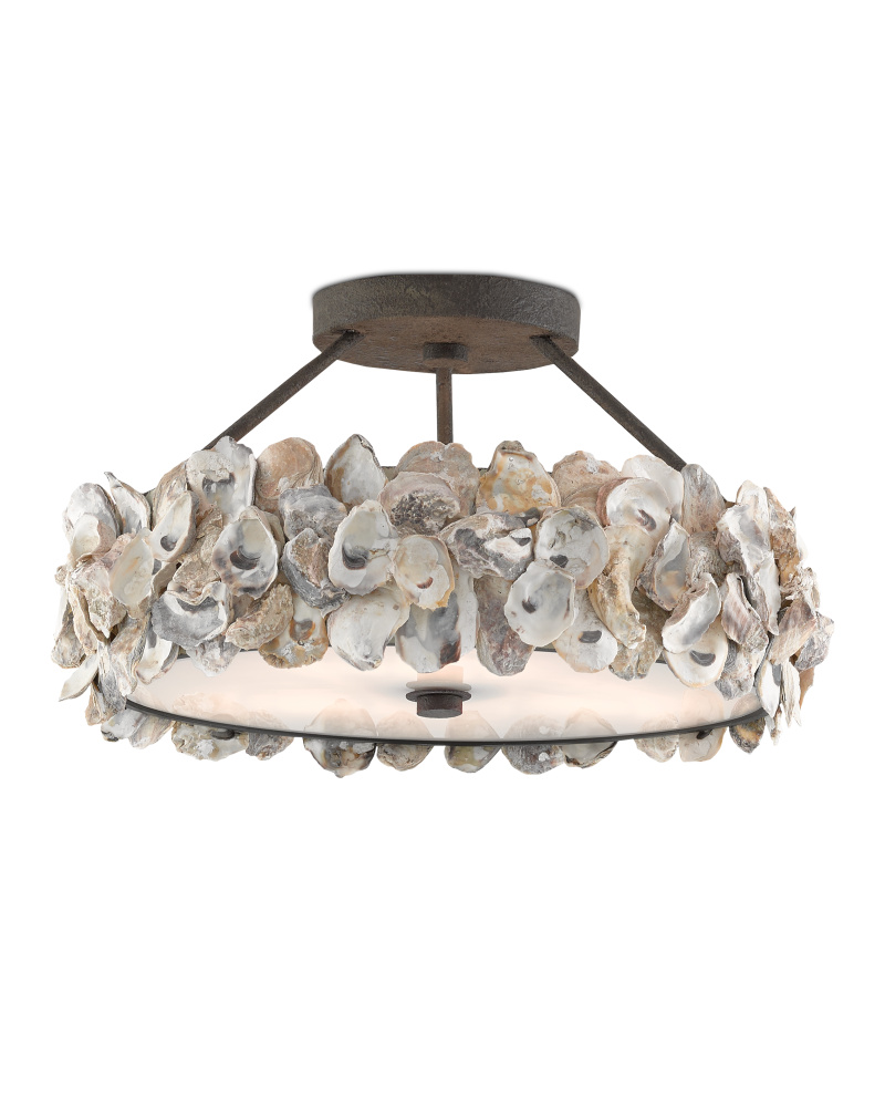Our Oyster Semi-Flush has a robust charm, its ring of natural oyster shells bursting with seaside tones and textures that glow from within. The simplicity and rusticity of the wrought iron frame that has been treated to a textured bronze finish makes this three-light fixture, which measures 19 inches in diameter by 10 inches high, a kicky lit accent for a seaside cottage or an urban oasis on the waterways.