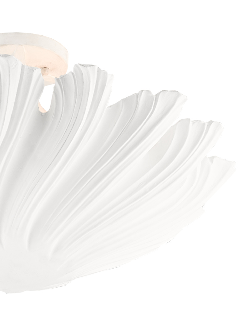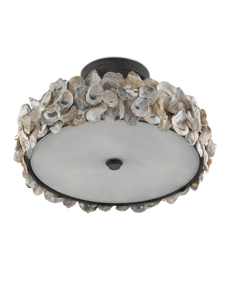 Our Oyster Semi-Flush with its ring of natural oyster shells bursting with seaside tones and textures has a robust charm. The simplicity and rusticity of the wrought iron frame in a textured bronze finish make this shell semi-flush a commanding ceiling light.