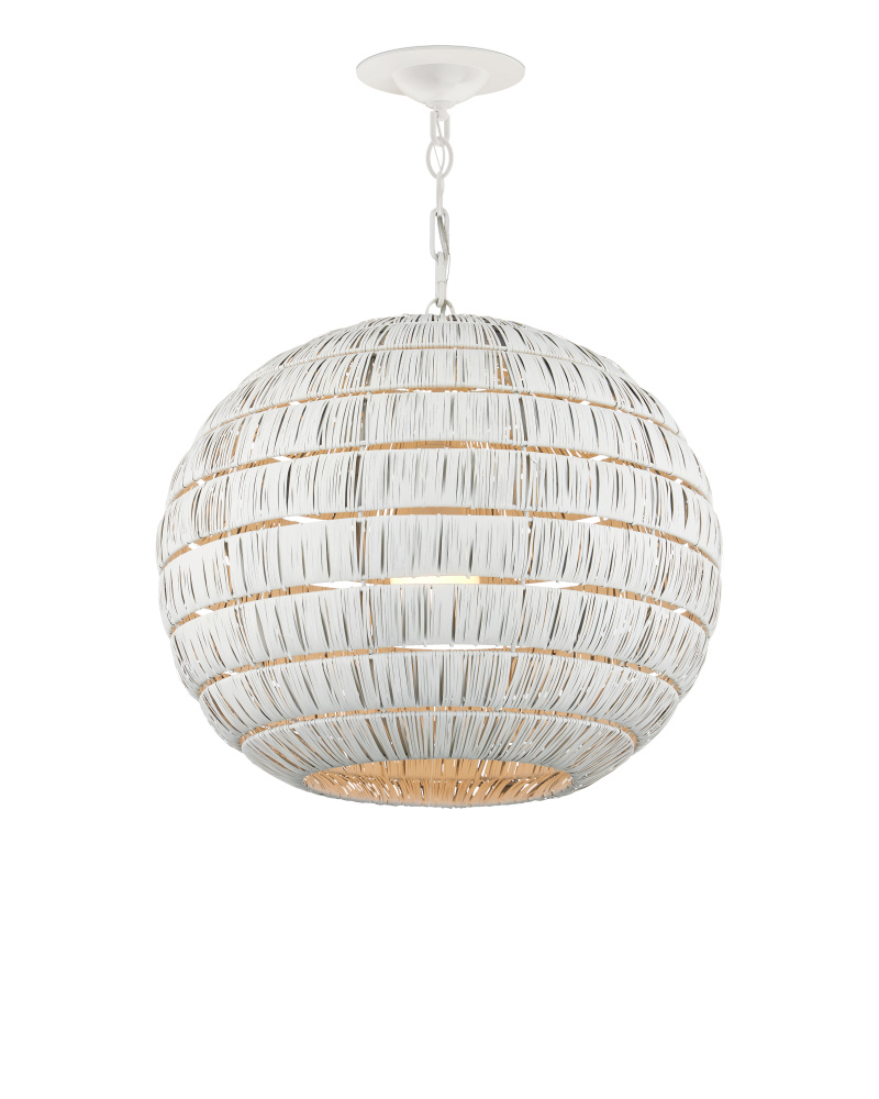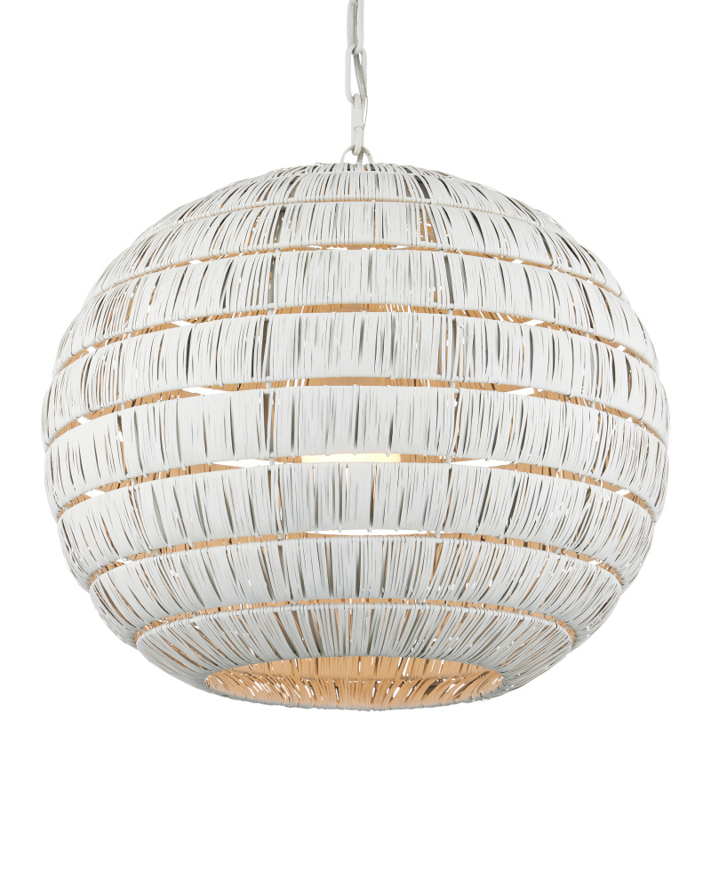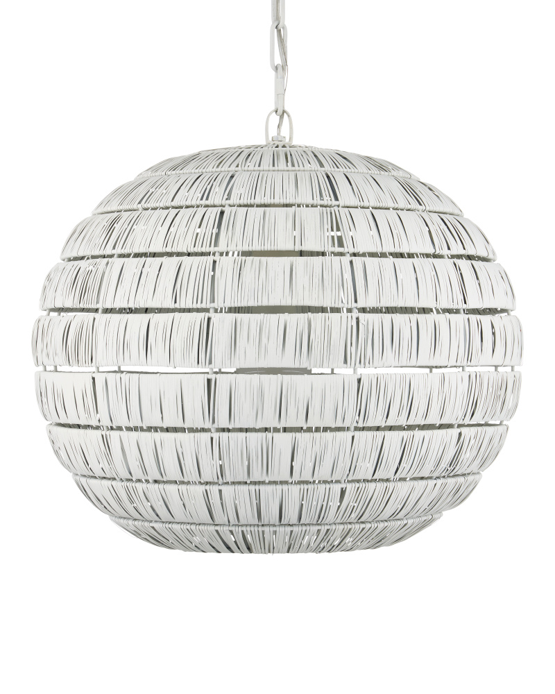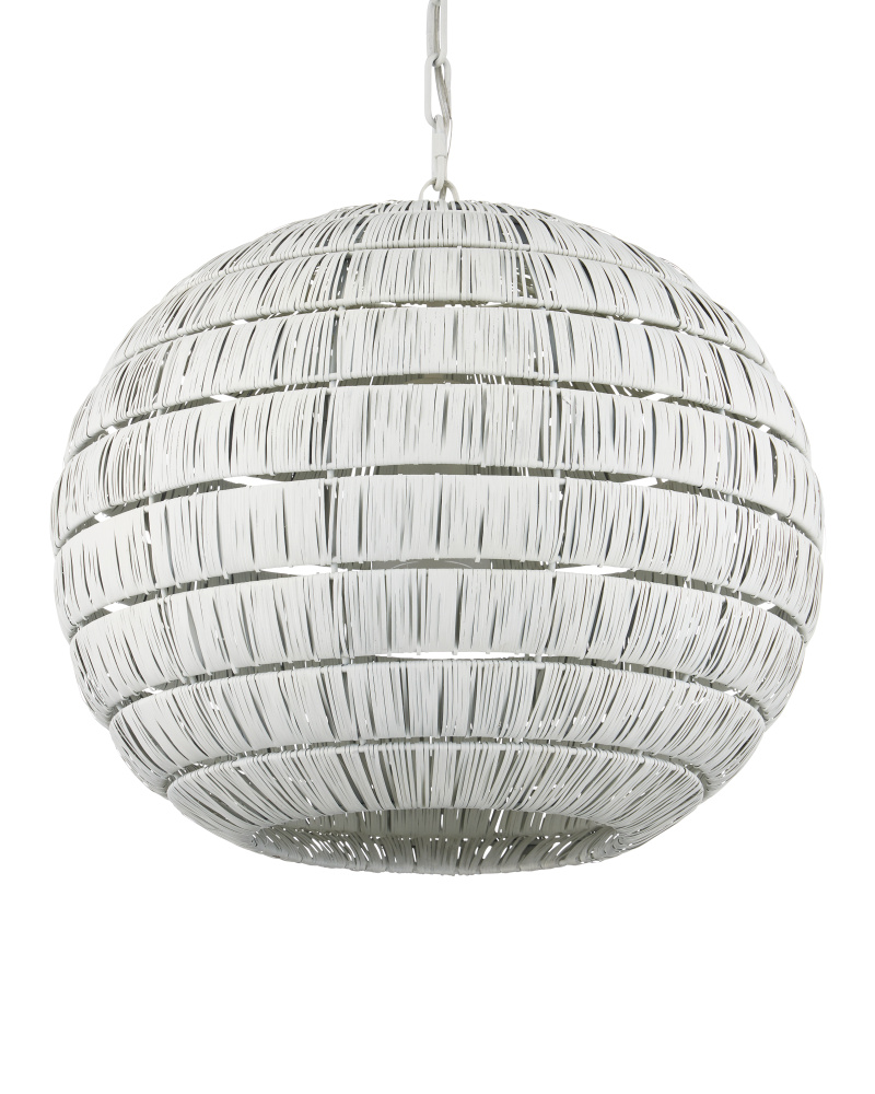 The Panopolis White Pendant is created using a painstaking process whereby artisans wrap individual thin strips of metal around rings that are spaced evenly to form a textural globe. The spaces between the wrapped tiers and the open bottom allow more light to filter through. This orb pendant will cast powerful patterns onto surrounding walls. Adjustable from 26" to 92.5" with use of included chain/rod kit/cable. If your space calls for a longer drop, additional chain/rods/cable is available for purchase.
