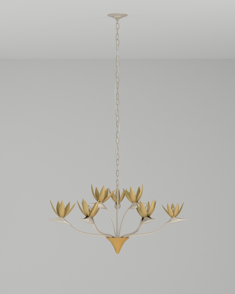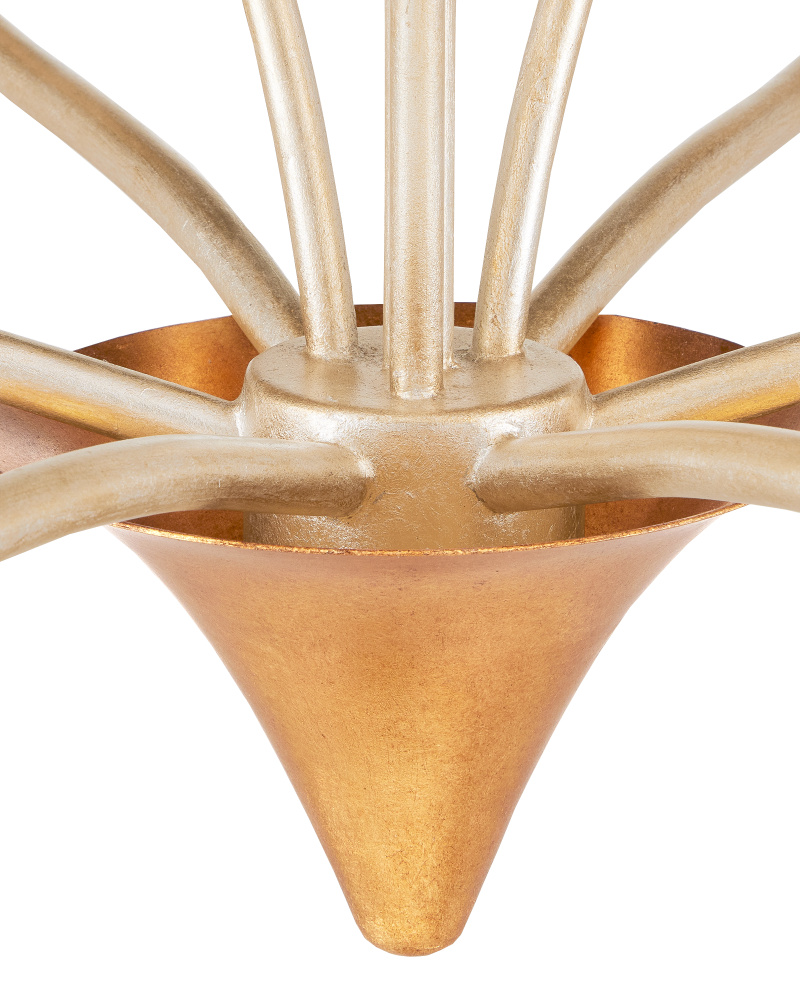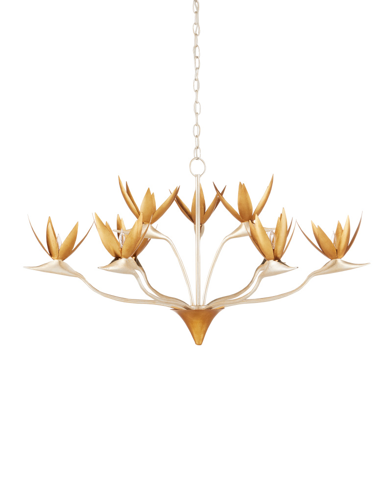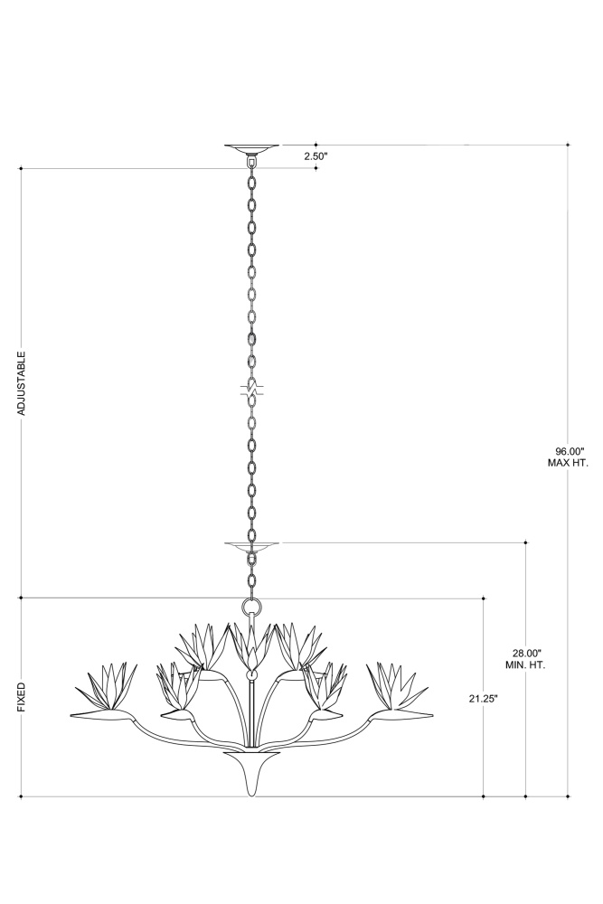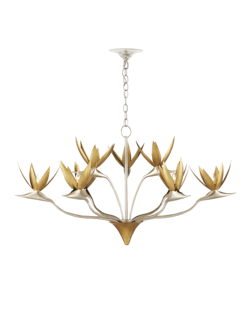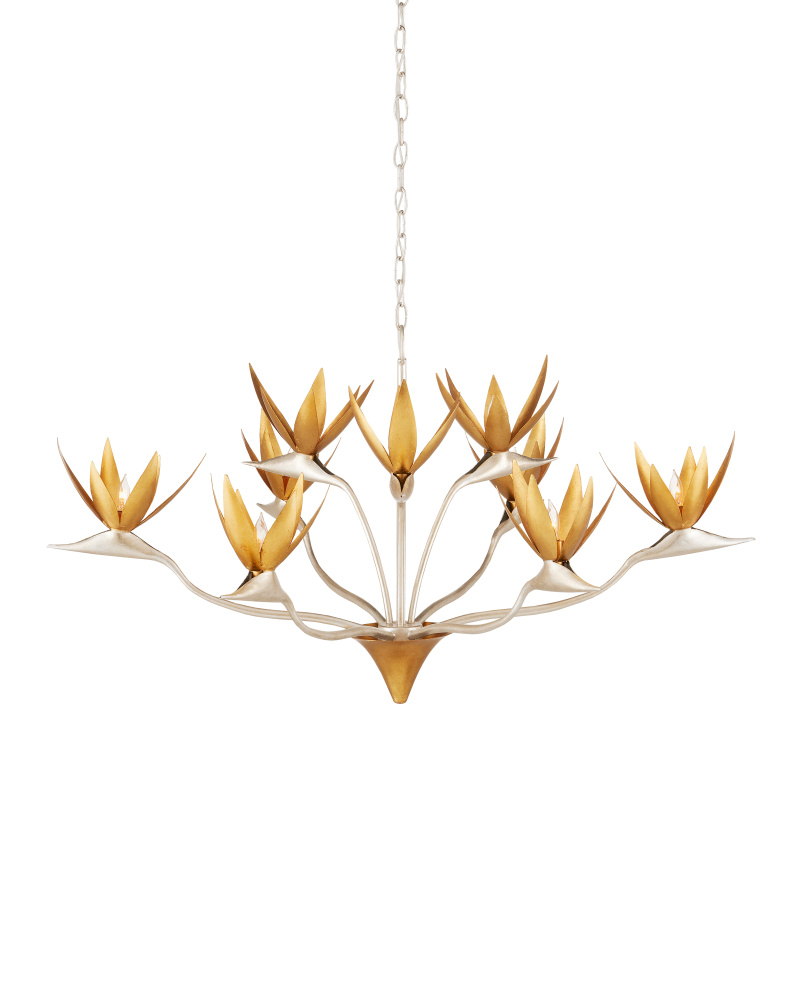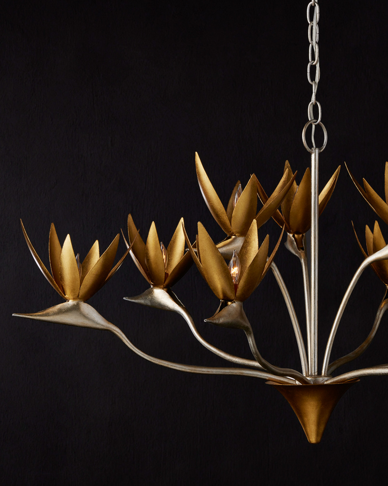Made of steel, the Paradiso Chandelier has a lyrical shape inspired by the Strelitzia reginae, more commonly known as the Bird of Paradise plant. The limbs that arc up and away from a central cone are in a contemporary silver leaf finish, while the cone and blossoms that flow around the light bulbs are in a contemporary gold leaf finish. This silver and gold chandelier is an example of how nature-inspired design elements are driving the biophilic movement. Adjustable from 28.25" to 95.75" with use of included chain/rod kit/cable. If your space calls for a longer drop, additional chain/rods/cable is available for purchase.