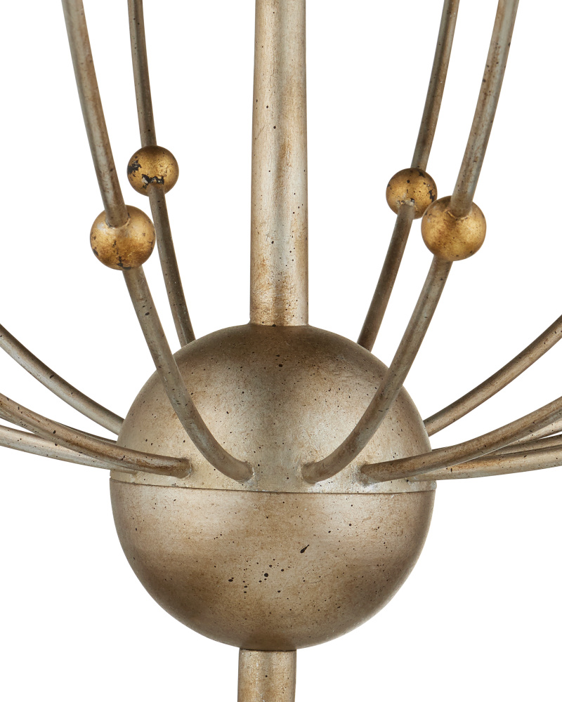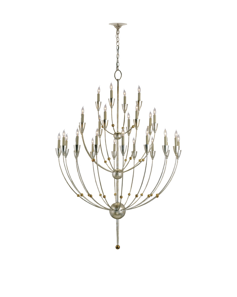 The Paradox Chandelier is a three-tiered silver chandelier with clusters of slender wrought iron arms reaching up toward wooden candle cups. The prevailing silver leaf finish brings this 28-light fixture a very modern feel, while the tiny gold-leaf globes that stud the arms bring a contrasting warmth. Adjustable from 68" to 135" with use of included chain/rod kit/cable. If your space calls for a longer drop, additional chain/rods/cable is available for purchase.