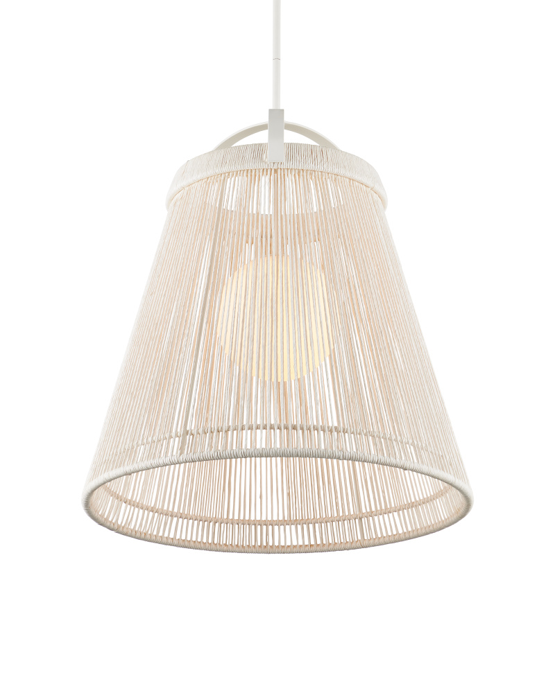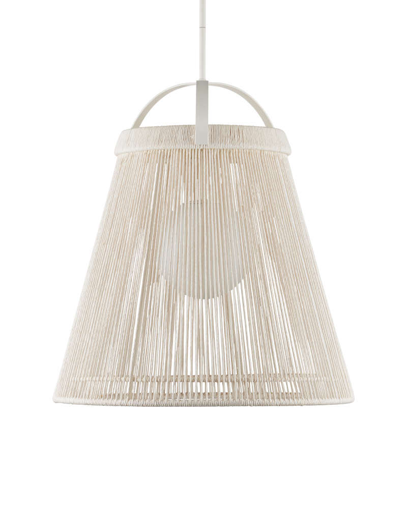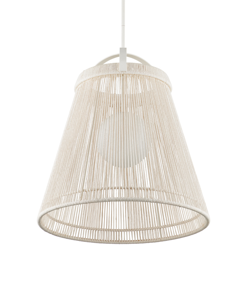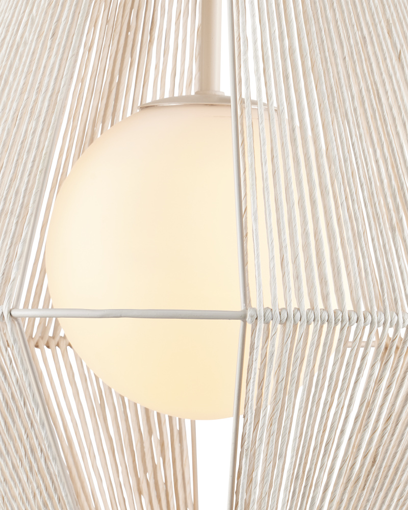 The Parnell Medium White Pendant resembles a bell made of Kraft Paper twine that is painstakingly double-wrapped on both the outside and the inside of the wrought iron frame in a gesso white finish. A frosted white glass globe holds the one light, which is dimmable, within the textured shade that flares to 24 inches in diameter at the bottom. Adjustable from 32.75" to 74.75" with use of included chain/rod kit/cable. If your space calls for a longer drop, additional chain/rods/cable is available for purchase.