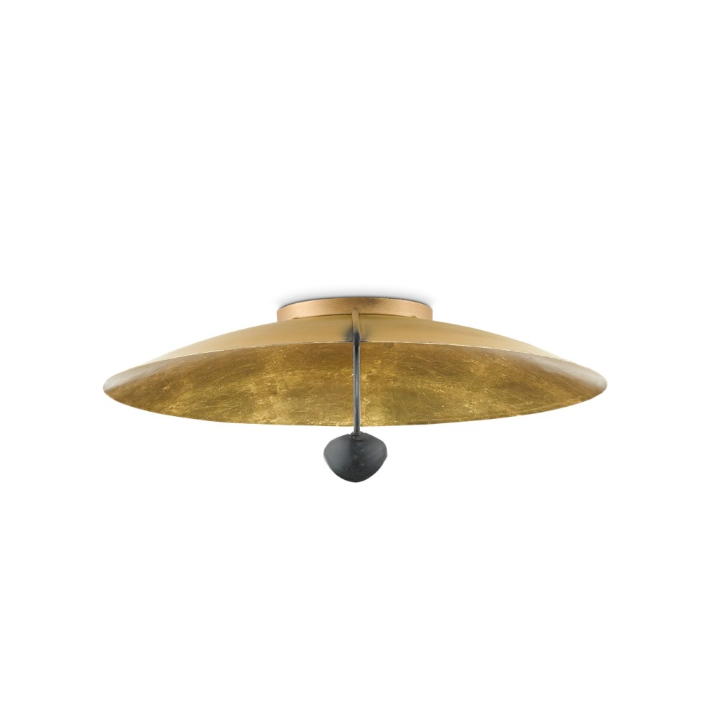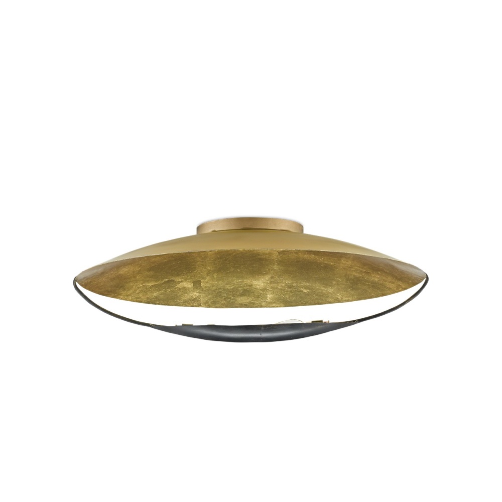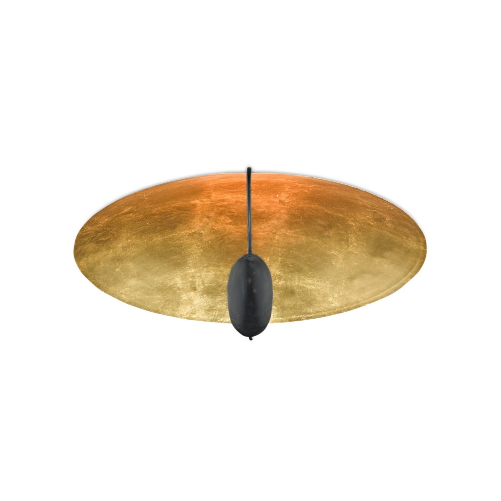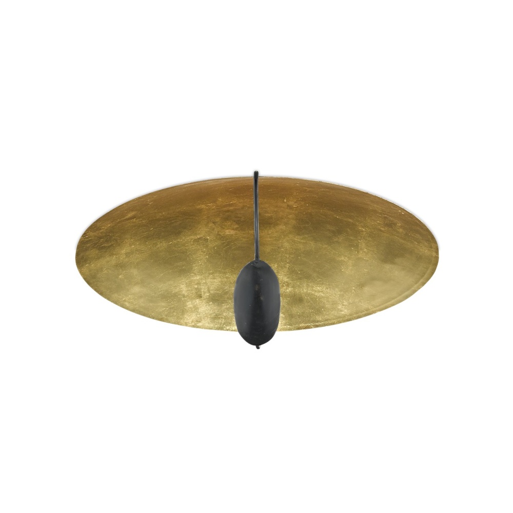 With our Pinders Flush Mount, made of wrought iron, the design team took a simplistic approach that mimics the pared-down aesthetic made famous by the Japanese. The cleverness of placing the light source in a cup-like extension affixed to the thin, curved arm, in French black, is genius, as the illumination will reflect off of the contemporary gold leaf finish to create a warm glow. We also offer the Pinders in a wall sconce.