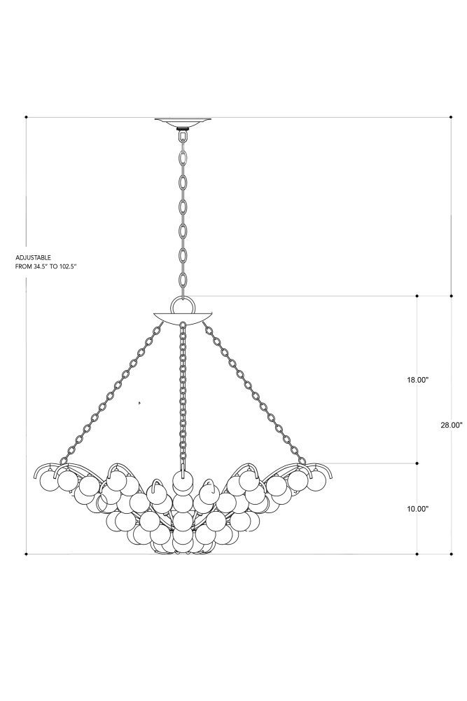 Blown glass balls flowing along the arcing arms of the Quantum Chandelier turn this classic fixture into something special. The delicate wrought iron frame on the silver chandelier in a contemporary silver leaf finish enhances the glow of the shimmering glass baubles. Adjustable from 34.5" to 102.5" with use of included chain/rod kit/cable. If your space calls for a longer drop, additional chain/rods/cable is available for purchase.