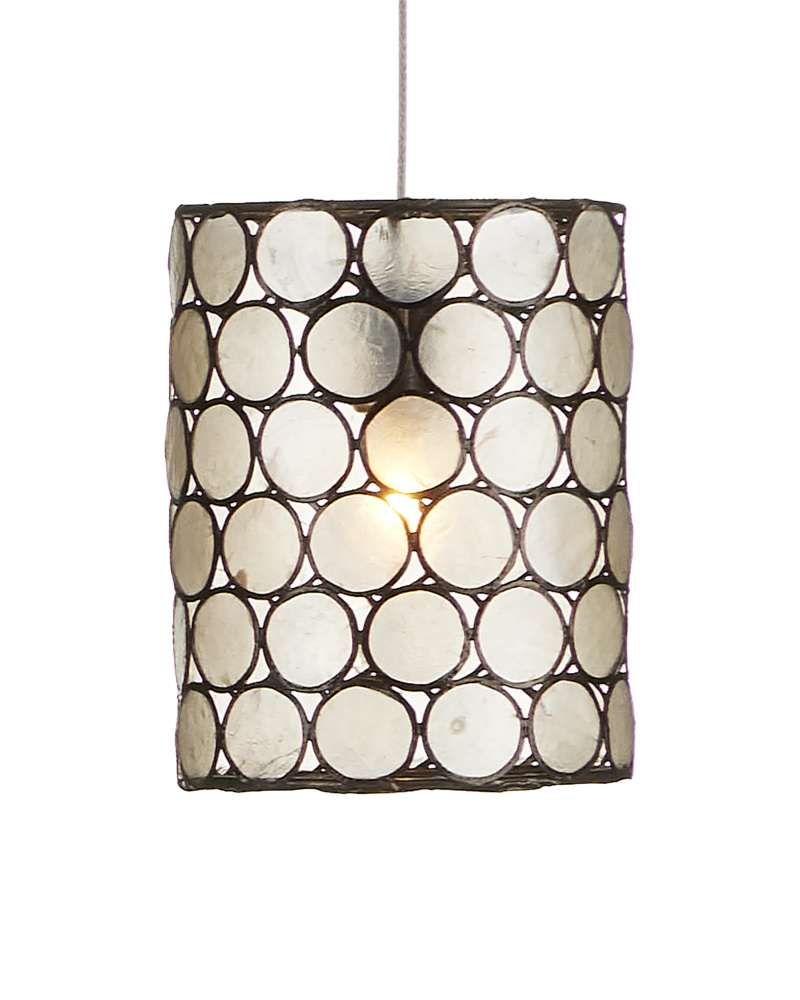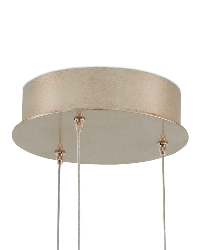 Natural Capiz shell and wrought iron in a Cupertino finish create a luminous circular pattern on the shades of the Regatta 3-Light Multi-Drop Pendant. Each cylindrical element has such a pleasing glow when light shines through the lustrous natural material. There is great artistry in achieving such a complex pattern, as each slice of shell has to be surrounded in metal and soldered into a frame once the metal circles are joined to each other. The canopy of this piece is luminous in a painted silver finish. This fixture is among Currey & Company's multi-drop pendant collection, which includes multiple configurations.