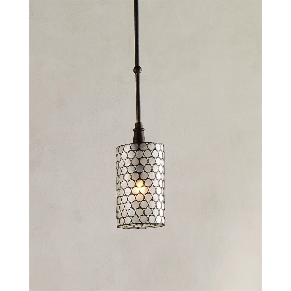 Natural Capiz shell and wrought iron in a Cupertino finish create a luminous circular pattern on the shade of the Regatta Pendant. The cylindrical pendant has such a pleasing glow when light shines through the lustrous shade. Given its petite size, the shell pendant is perfect for grouping or hanging in rows. Adjustable from 22" to 49" with use of included chain/rod kit/cable. If your space calls for a longer drop, additional chain/rods/cable is available for purchase.