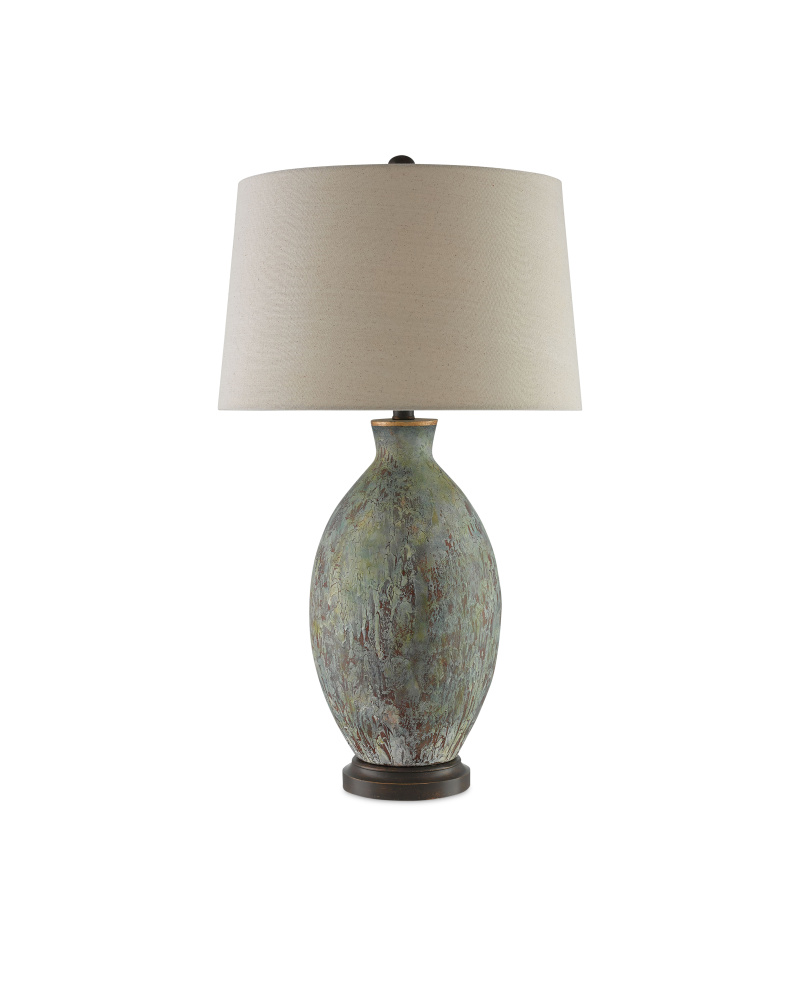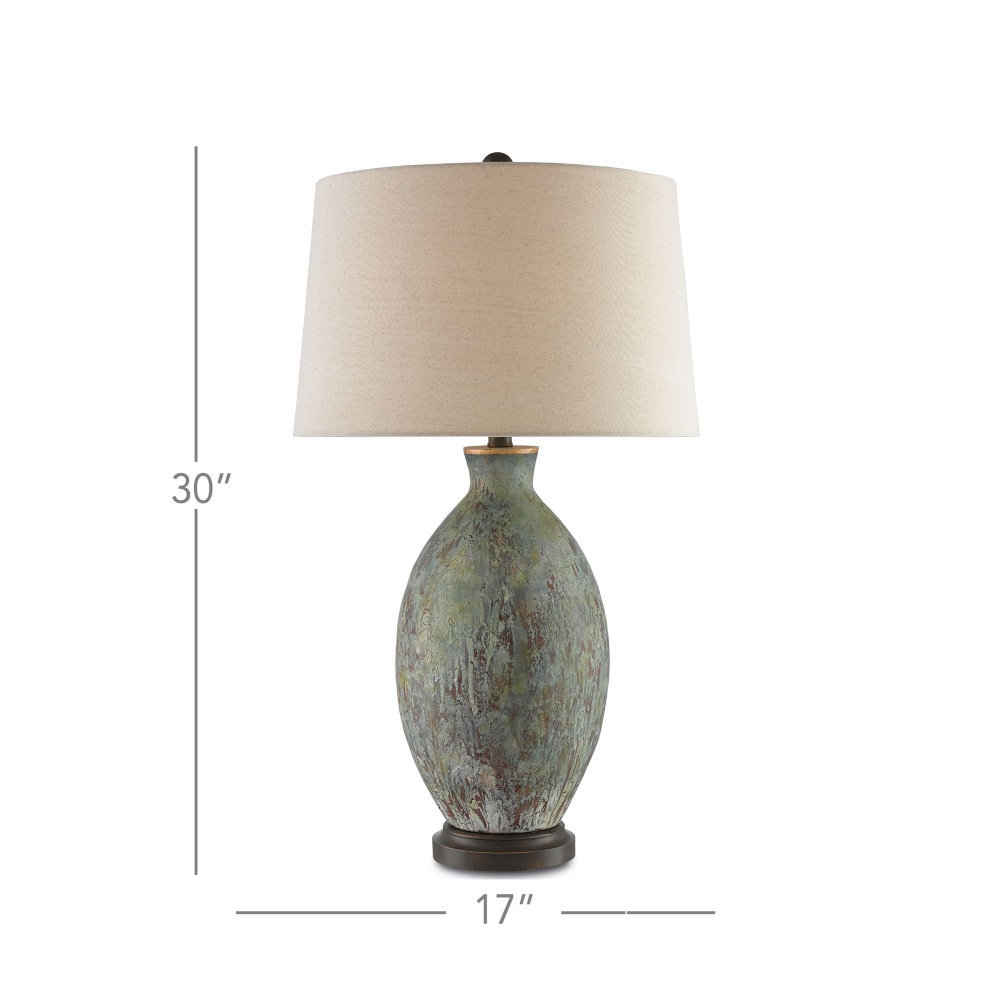 The heavily distressed Remi Table Lamp is made of terracotta that was dripped with green and dark red glazes. The bronze gold finish on the hardware enhances the patina by giving the green lamp the feel of aged copper. The Remi is topped with a flax linen shade.