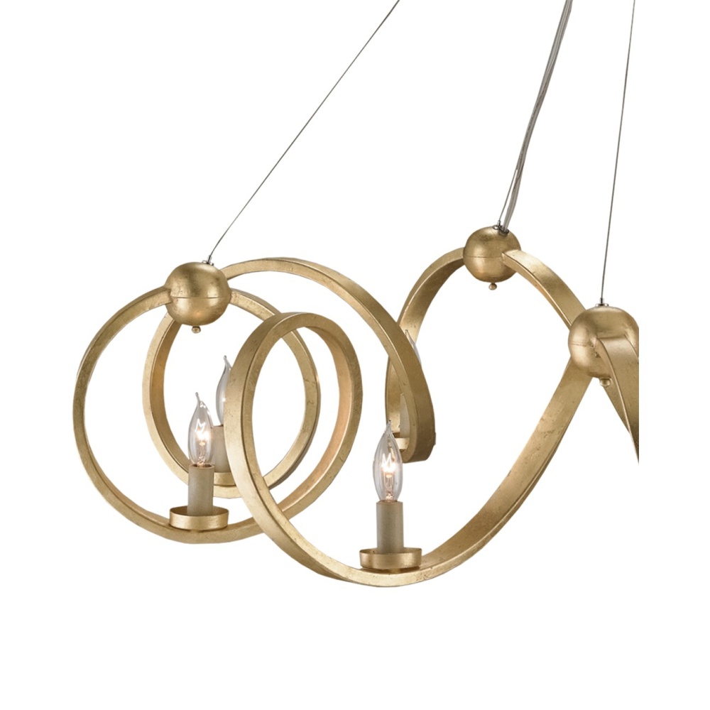 The gold version of our Ringmaster Chandelier is cold-forged and requires a team of strong men to achieve its stellar design. A contemporary gold leaf finish is applied to the graceful wrought iron curves to resemble a very regal slinky. Ten lights provide the ultimate illumination emanating from the undulant fixture. We also offer this chandelier in a contemporary silver leaf finish.