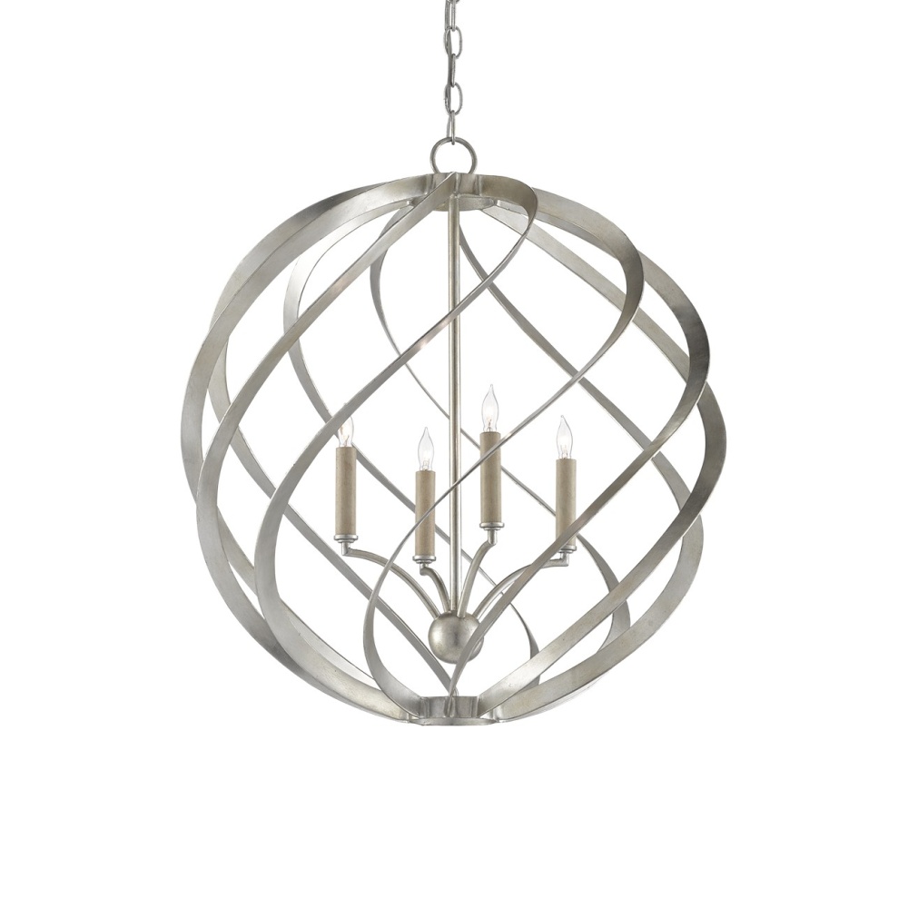 The globe shape of the Roussel Orb Chandelier is formed by bands of wrought iron in a contemporary silver leaf finish. These are turned to make them seem to undulate. The candle arms perched on thin stems seem to be floating within the swirling atmosphere of this silver chandelier. Adjustable from 32.75" to 101" with use of included chain/rod kit/cable. If your space calls for a longer drop, additional chain/rods/cable is available for purchase.