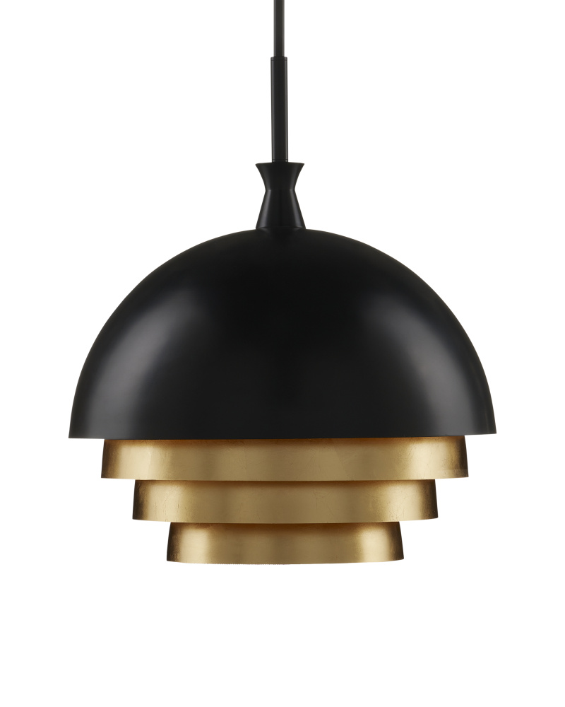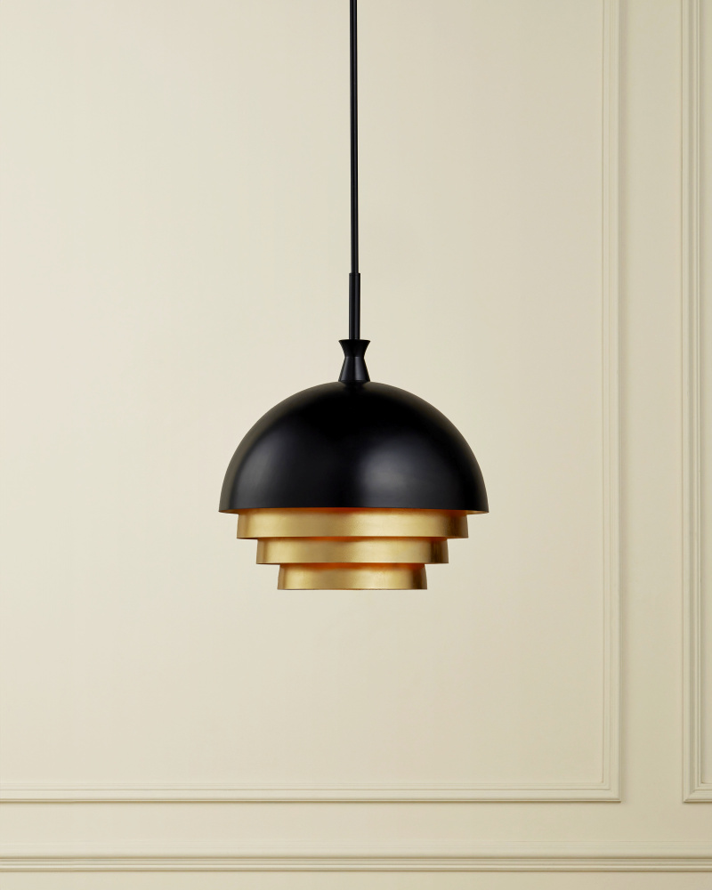 The cascading forms that make up the shade of the Salviati Large Black & Gold Pendant are fashioned from steel in a contrasting mix of deep black and luminous gold leaf finishes. Telescoping rings are inserted into the larger dome in a way that allows the illumination to reflect on each of the gold surfaces for an enhanced glow. The simplicity of the stem and hardware from which it hangs heightens the contemporary feel of this black pendant. Adjustable from 22.25" to 64.25" with use of included chain/rod kit/cable. If your space calls for a longer drop, additional chain/rods/cable is available for purchase.