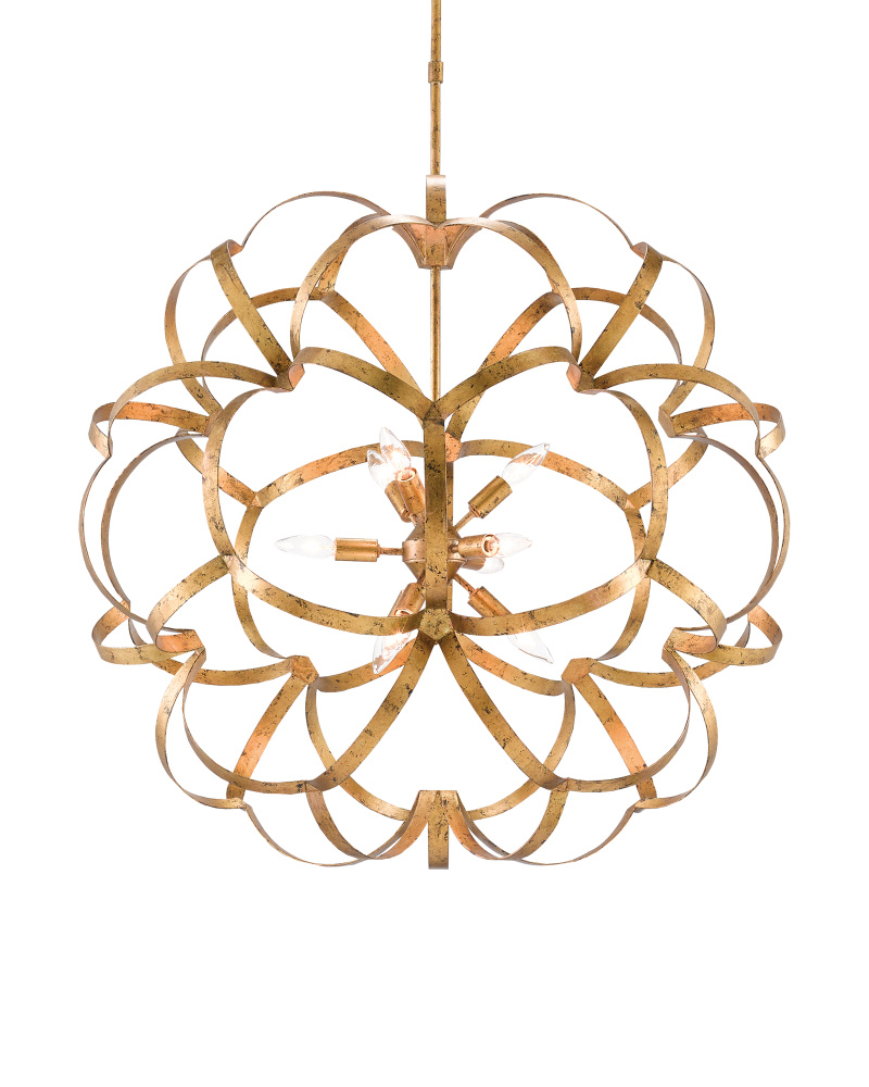 As lyrical in style as the poetry written by the namesake of our Sappho Orb Chandelier, this fixture is a veritable festival of winsomeness. The ribbons of wrought iron seem to be fluttering around the nine lights, which proves the talent of our craftspeople who can take such a rigid material and make it feel graceful. The finish artisans then covered the composition in a new gold leaf, which gives the fixture a gleaming hint of patina.