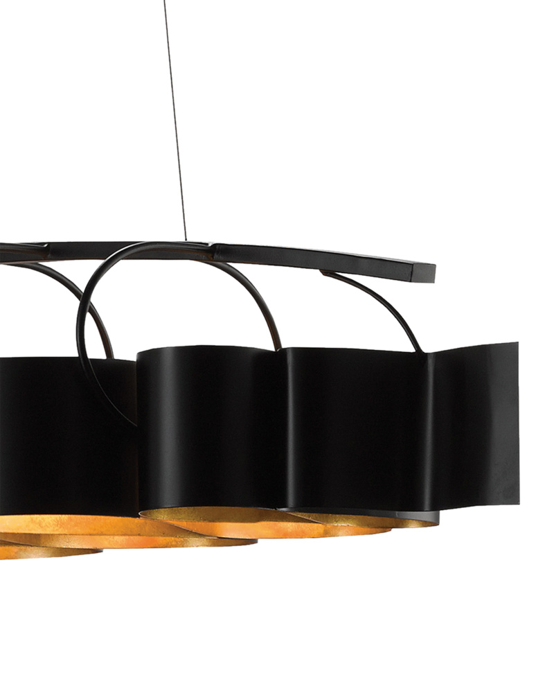The Sappho Orb Chandelier is made of ribbons of wrought iron fluttering around its nine lights. This is a fixture that illustrates the talent of our craftspeople who can make such a rigid material feel graceful. Once it reached its final form, the gold chandelier was finished in a new gold leaf to make it shine.
