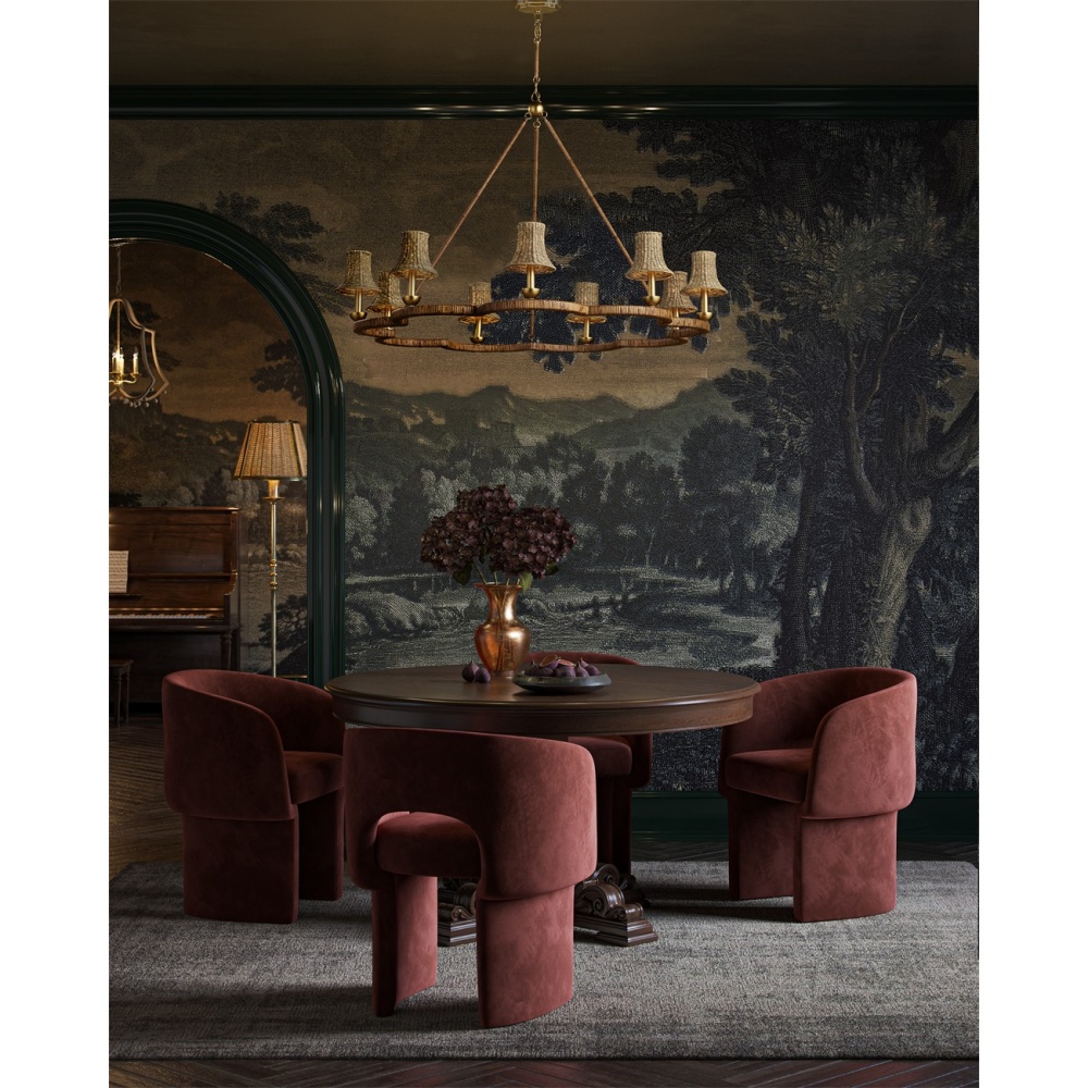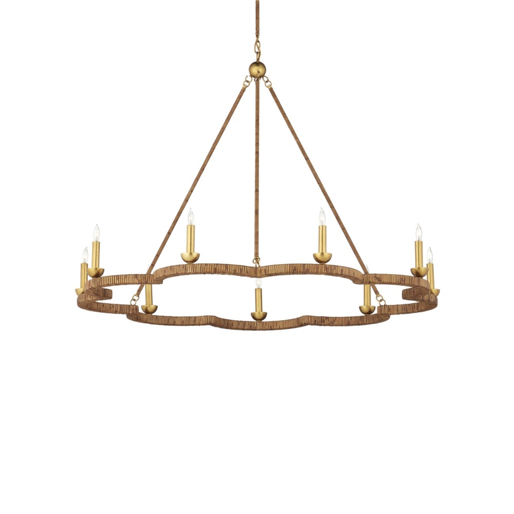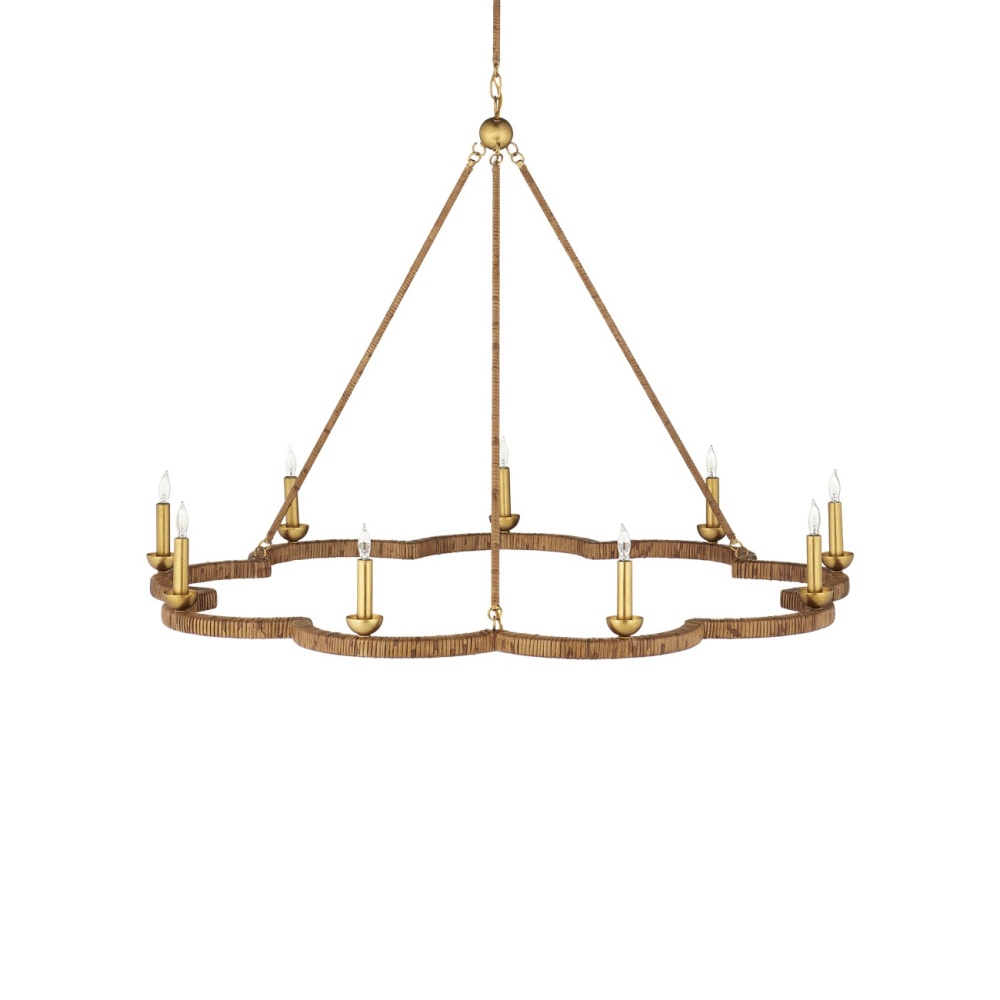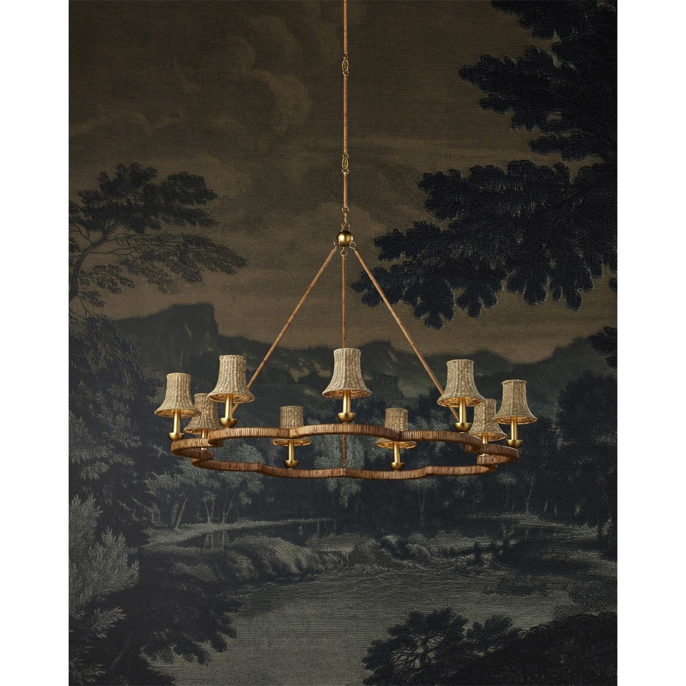 The Savoie Chandelier by Suzanne Duin has the French charm for which her designs are known. The scalloped frame and rods that connect it to the pretty floral-shaped canopy are covered in rattan. Where it is not wrapped in this natural material, it is finished in a contemporary gold leaf finish that brings added warmth to the overall composition. This lovely rope-wrapped chandelier brings a glow and introduces the allure for which the South of France is renowned. Adjustable from 37" to 86" with use of included chain/rod kit/cable. If your space calls for a longer drop, additional chain/rods/cable is available for purchase.