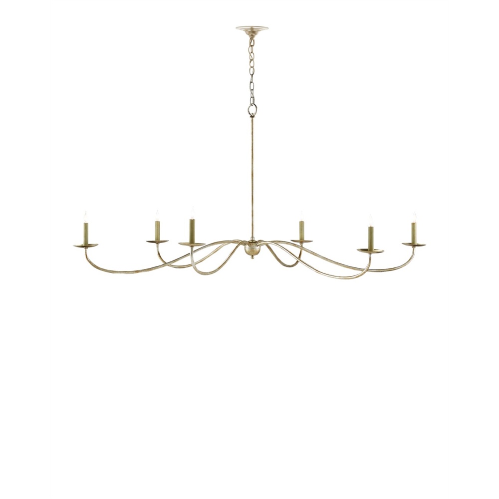 The silver version of the Saxon Chandelier reaches toward the outer edges of its circumference while simultaneously reaching back into the past and forward into the future. Its shape is a quintessential nod to a bygone era but its slender lines read as strikingly modern, due in part to its impressive size of 63 inches in diameter. The six-light Saxon chandelier has been treated to a silver Granello finish. We also offer this fixture in a Zanzibar finish.
