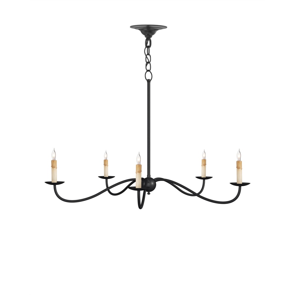 The Saxon Small Black Chandelier is one of our most graceful chandeliers with arms that fluidly stretch outward. Its shape and the Zanzibar black finish are nods to a bygone era, but its arcing slender lines make its profile modern. Adjustable from 27.5" to 96" with use of included chain/rod kit/cable. If your space calls for a longer drop, additional chain/rods/cable is available for purchase.