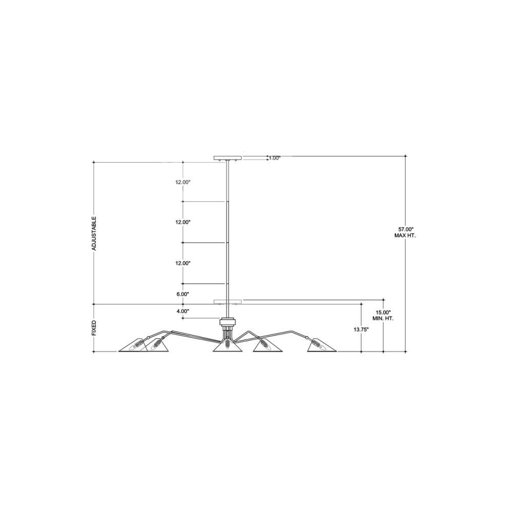 The Serpa Black Chandelier has a lightly weathered feel thanks to the rubbed French black finish on the slender arms and shades. Made of wrought iron, the spidery fixture has a vintage feel with mid-century modern lines. The shades have gold leaf interiors, which warms the illumination coming from this black chandelier with an industrial feel. Adjustable from 15" to 57" with use of included chain/rod kit/cable. If your space calls for a longer drop, additional chain/rods/cable is available for purchase.