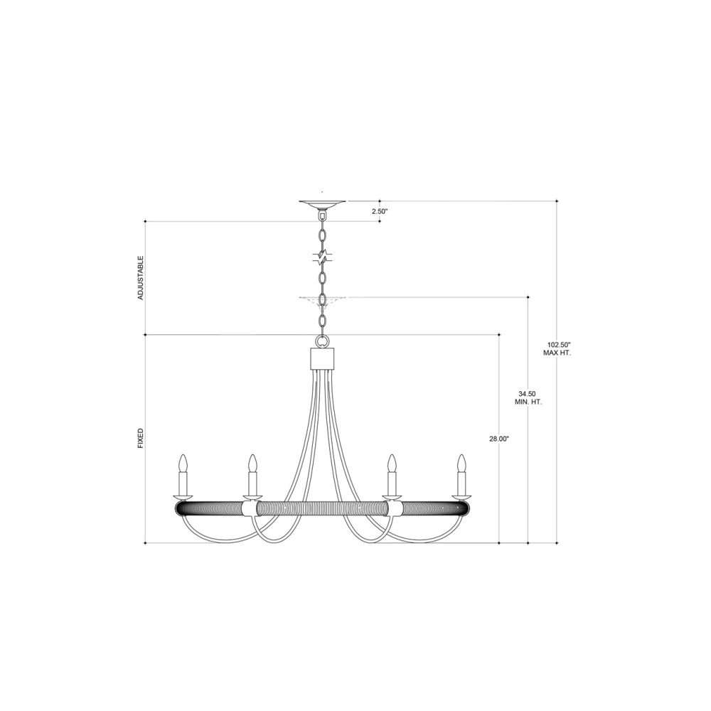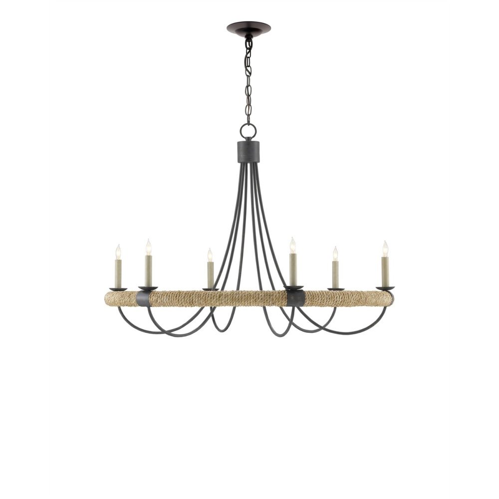 The design of the Shipwright Chandelier brings a nautical theme to life with its large scale and thoughtful details. This is achieved with the abaca rope that wraps the ring holding the bobeches and candle arms. Made of wrought iron in a mix of French black and smokewood finishes, the rope chandelier is decidedly sea-side worthy while also checking the box on modern farmhouse style. Adjustable from 34.5" to 102.5" with use of included chain/rod kit/cable. If your space calls for a longer drop, additional chain/rods/cable is available for purchase.