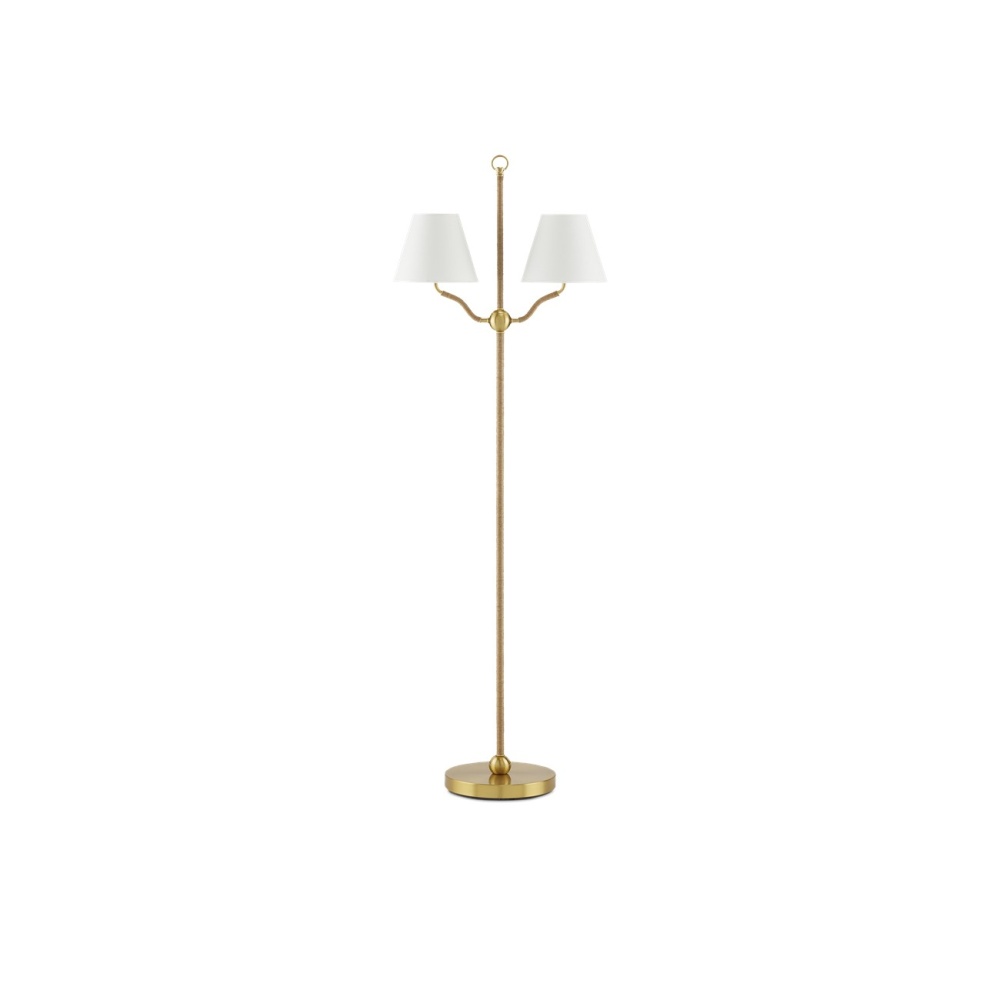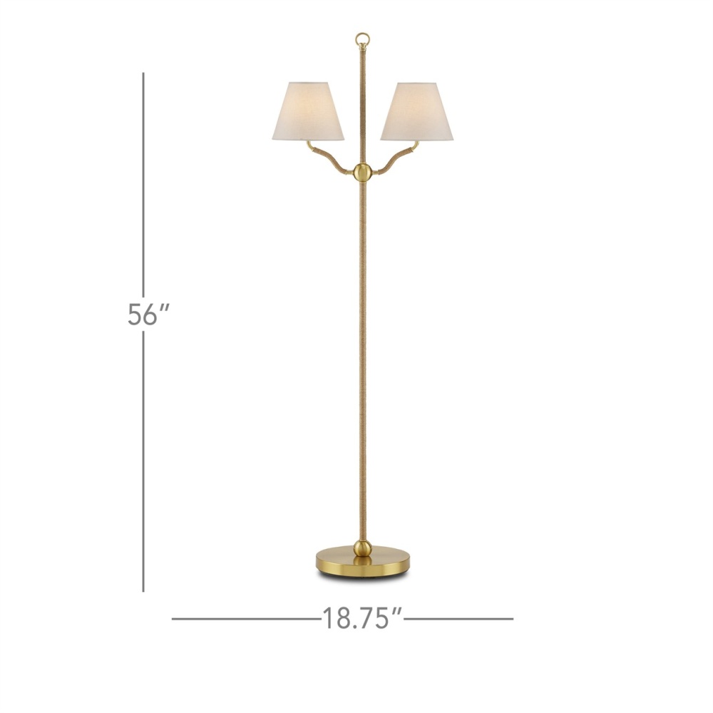 The Sirocco Floor Lamp features a light profile, with all but the main decorative elements wrapped in jute rope. These include the ring at its apex, the small globes at its base and the one connecting the forked arms, and the base itself. Made of steel and natural plated antique brass, the rope floor lamp is fitted with two off-white linen shades. This is a petite floor lamp designed to be a decorative accent in a space.