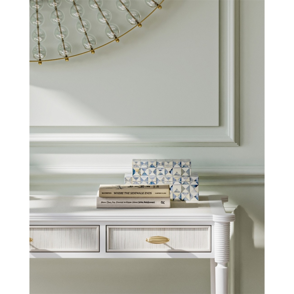 The Sky Blue Box Set illustrates the talents of the artisans who create the surfaces of these white decorative boxes. The mosaics in white and blue bone are painstakingly arranged and affixed to the wood boxes. The patterns achieved by the triangular shaped segments bring this white decorative box a textural feel while the patina washed on top gives it an aged appeal.