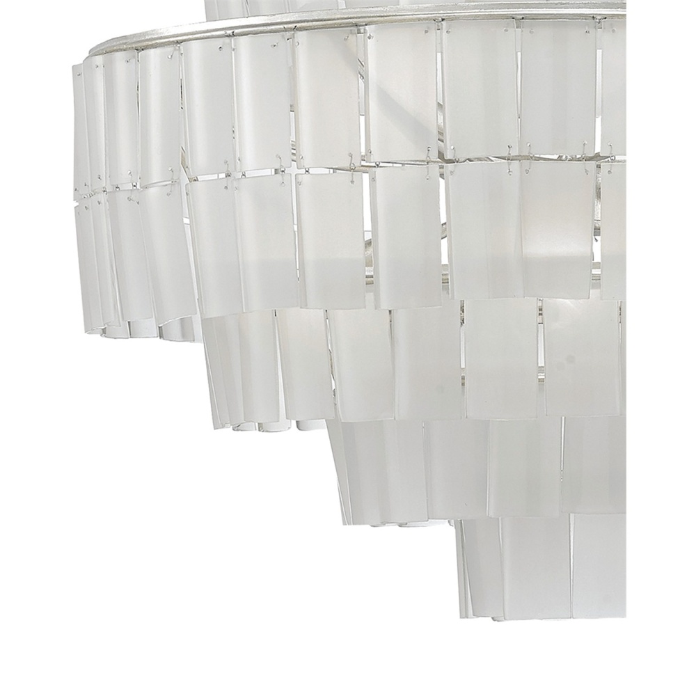 Each layer of the Sommelier Blanc Chandelier is made of individually-cut pieces of frosted glass sourced from recycled bottles. Each piece is textured and unique in its own way to enhance the frame's bright contemporary silver leaf finish. Due to the nature of recycling and the variations in tones, each of these eight-light fixtures is one of a kind. We also offer a version of the Sommelier with green glass. If you prefer a cascading shape, take a look at our Vintner chandelier the same glass.