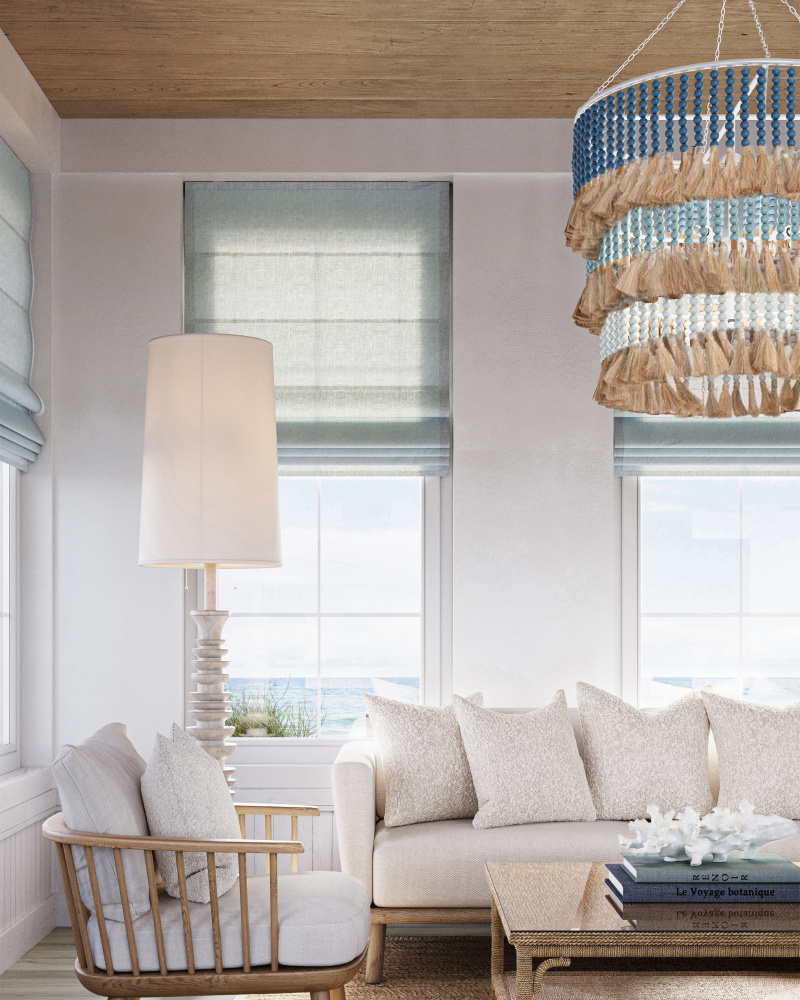 Jamie Beckwith is the mastermind behind the St. Barts Blue Chandelier, which is made of wood beads in a mix of white, mist blue, and denim blue hues that echo the colors of the sea. These hang from a triple-tier wrought iron frame in a sugar white finish. The natural abaca rope on which the beads are strung is knotted and snipped by hand to leave elemental tassels that will flutter when stirred by a lively breeze. The beaded chandelier is one of several ocean-inspired designs by Beckwith. Adjustable from 53.5" to 120.5" with use of included chain/rod kit/cable. If your space calls for a longer drop, additional chain/rods/cable is available for purchase.