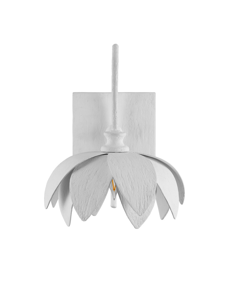 The Sweetheart Wall Sconce is a nature-inspired design. Made of metal in a Gesso White finish, the floral fixture opens its petals to its light source. The white wall sconce can be mounted so that the fixture reflects light up rather than down if desired.