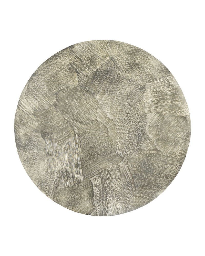 The shape of the Talia Champagne Accent Table is a riff on turned wood candle-sticks, but this silver accent table is made of cast aluminum in a champagne gold finish.