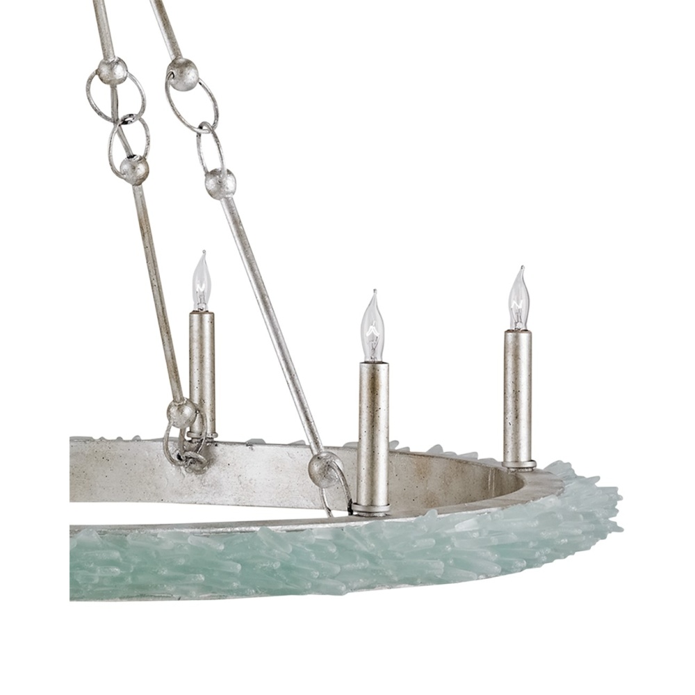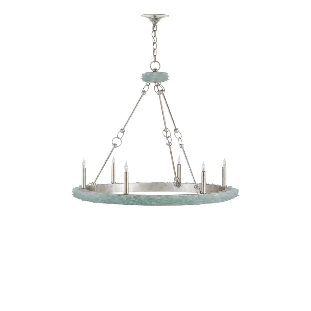 The natural sea-glass that rims the edge of the top and bottom circular elements on the frame of the lovely Tidewater Chandelier is a nod to the balmy waters of the Caribbean. Where this masterpiece of artistry isn’t covered in pale aqua glass, it has been treated to a silver Granello finish. The inter-locking arms that attach the upper ring to the lower one finish off the crown-like frame of this lovely six-light fixture.
