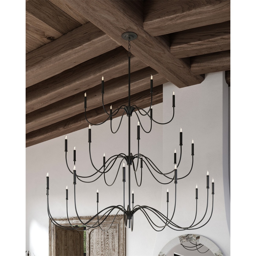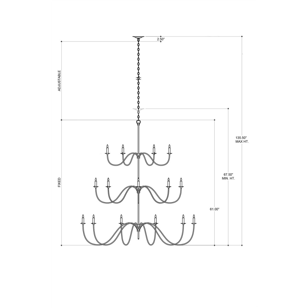 A nod to Early American style, the Tirrell Large Chandelier has graceful arms that arc upward to hold its candle sleeves with simple dignity. The black chandelier is made of wrought iron in an antique black finish. Adjustable from 67.5" to 135.5" with use of included chain/rod kit/cable. If your space calls for a longer drop, additional chain/rods/cable is available for purchase.