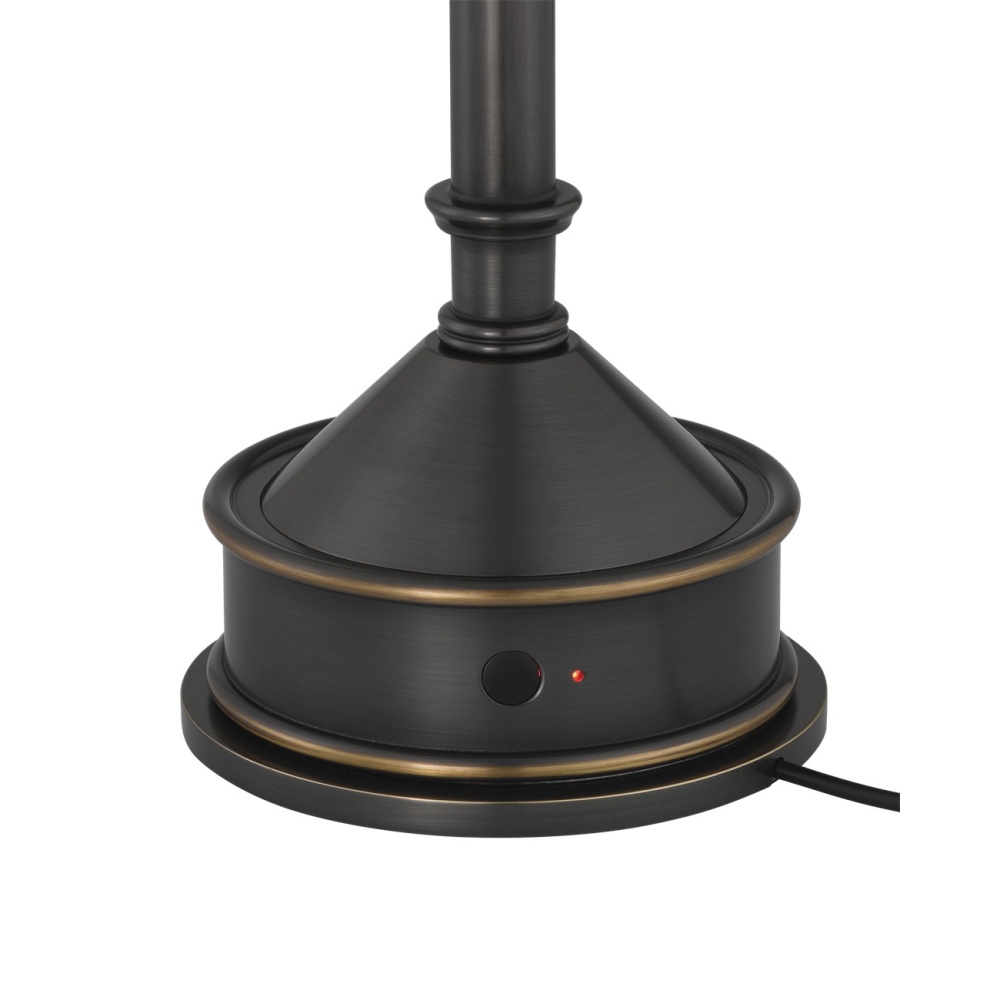The Traipse Bronze Cordless Table Lamp is a black lamp that has a way of getting around. The metal lamp in an oil-rubbed bronze finish is petite in size, and its base holds the on/off switch. The matching metal shade has a diffuser on the bottom. to recharge, simply place the lamp on its separate charging pad.
