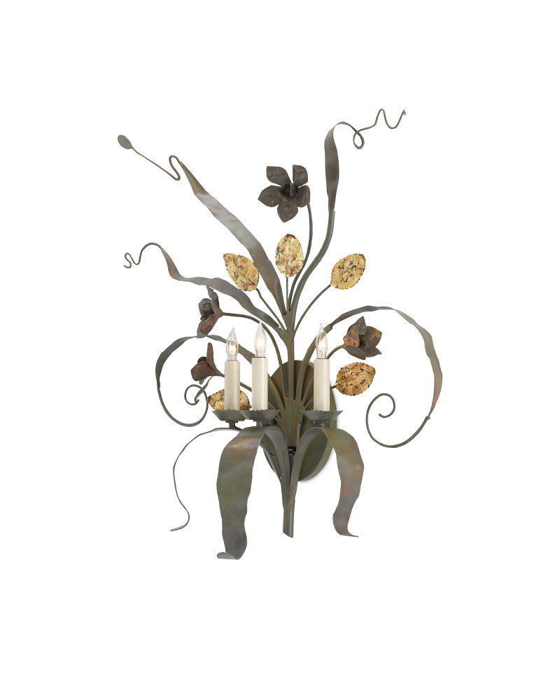 The Westley Wall Sconce has a mix of verdigris and antique gold leaf finishes on its surfaces. The intermingling of tones highlight flourishes, leaves, and flowers that bloom from the wall plate. The gray sconce with its whimsical design is included in our Bunny Williams Collection.