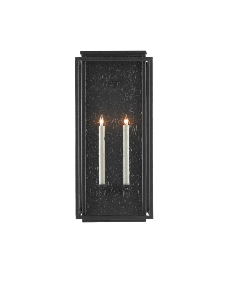 The Wright Medium Outdoor Wall Sconce in our Twelfth Street collection has an added armature surrounding the fixture to bring it an arts and crafts feel. It features a high-performance, weather-resistant Trilux finish that is fade resistant, crack resistant and rust resistant. We guarantee the finishes applied to our Twelfth Street pieces for five years. The metal on this black wall sconce in a midnight finish surrounds seeded-glass panes. It is certified for outdoor and damp locations, and we offer it in several sizes.