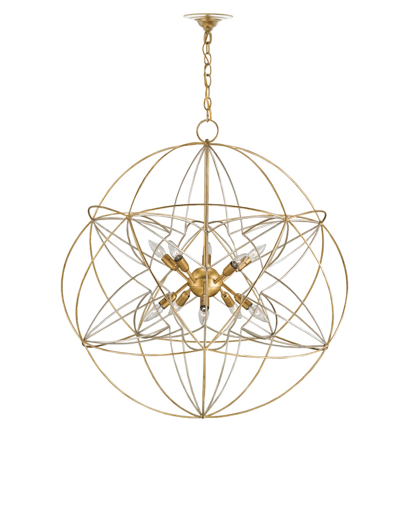 The undulant frame of the Zenda Orb Chandelier consists of a multitude of slender interlocking wrought iron shapes that, when viewed together, suggest a ball of atomic energy. Contemporary gold and silver leaf finishes bring an interplay of tones to this eye-catching gold chandelier. Adjustable from 41" to 108" with use of included chain/rod kit/cable. If your space calls for a longer drop, additional chain/rods/cable is available for purchase.