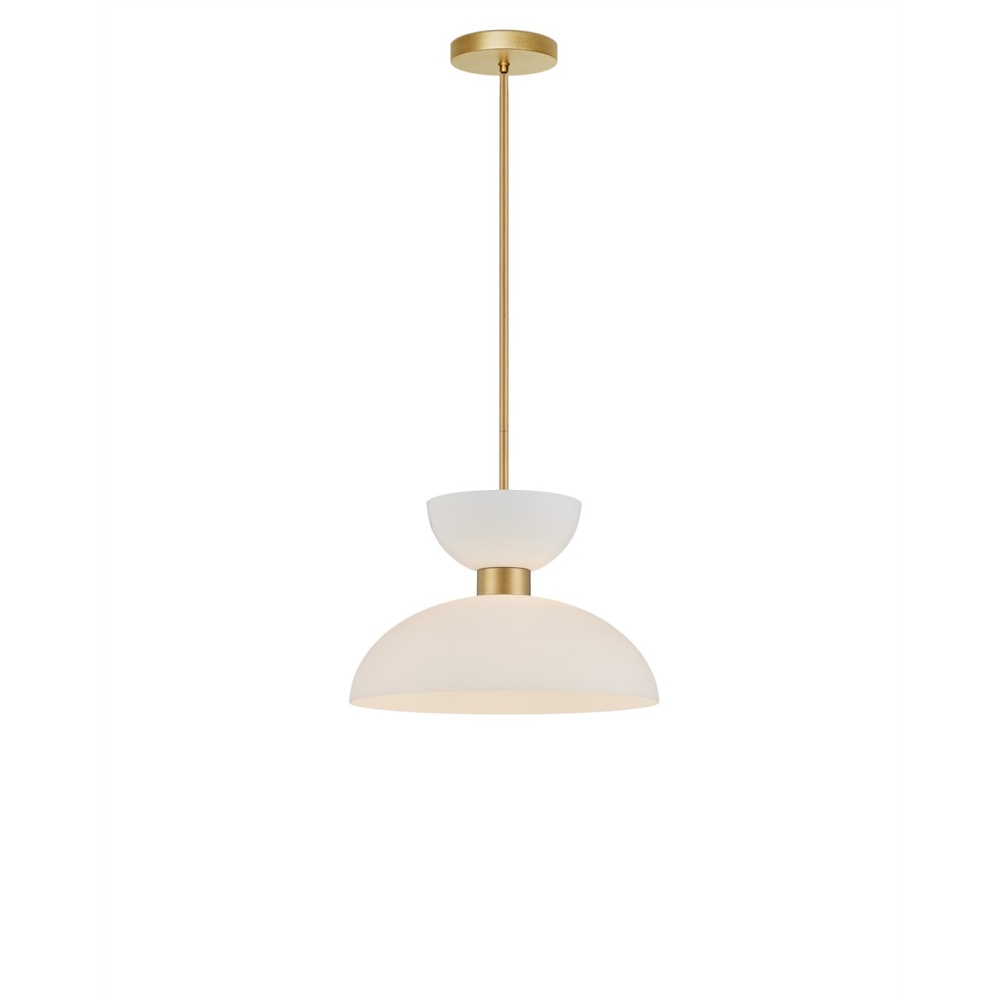 When the lights are switched off, it can be hard to tell that the top and bottom cup-shaped shades of the Zevio White Pendant are made of different materials. The fixture features a frosted glass shade on the bottom and a steel shade in a white finish on the top. The circlet that clinches these as they transition, along with the clean-lined stem from which the pendant hangs, are contrasting elements made of brass-toned metal. Adjustable from 16.5" to 58" with use of included chain/rod kit/cable. If your space calls for a longer drop, additional chain/rods/cable is available for purchase.
