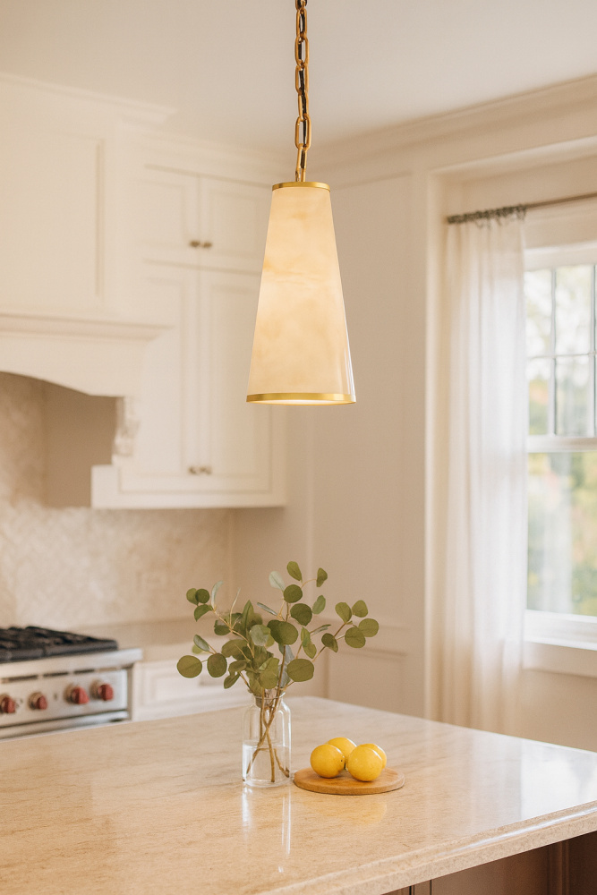1 Light Incandescent Pendant, Aged Brass w/ Marble Alabaster Shade