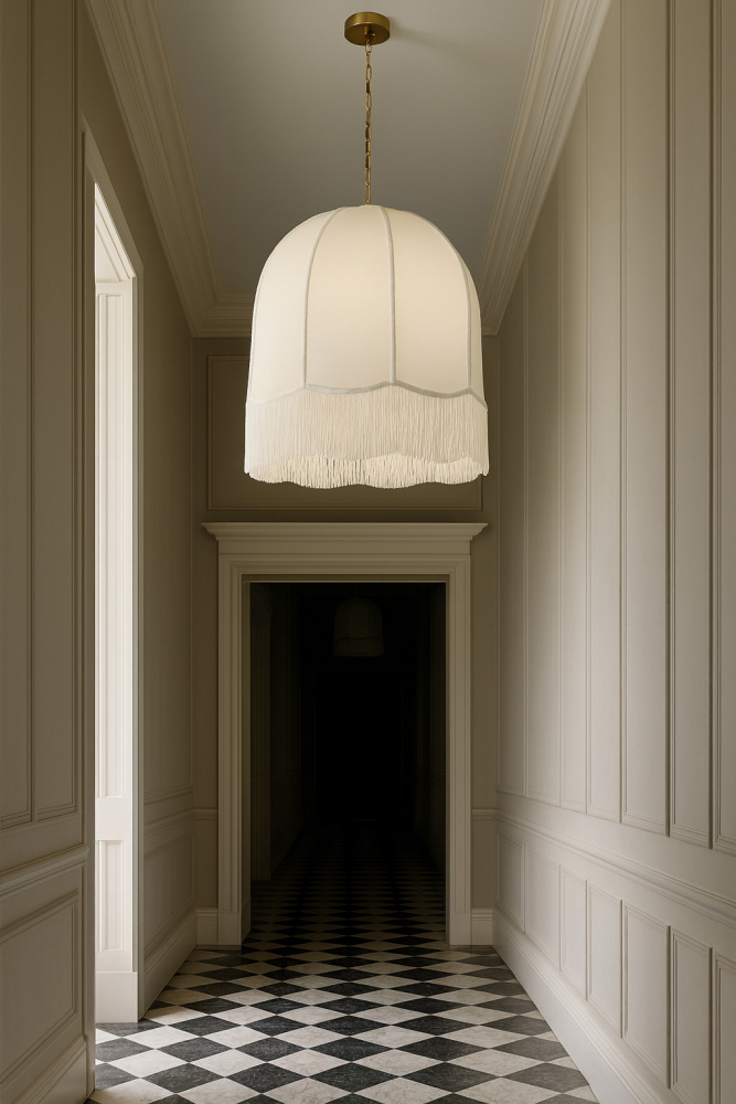 1 Light Incandescent Pendant, Aged Brass w/ White Fringe Shade