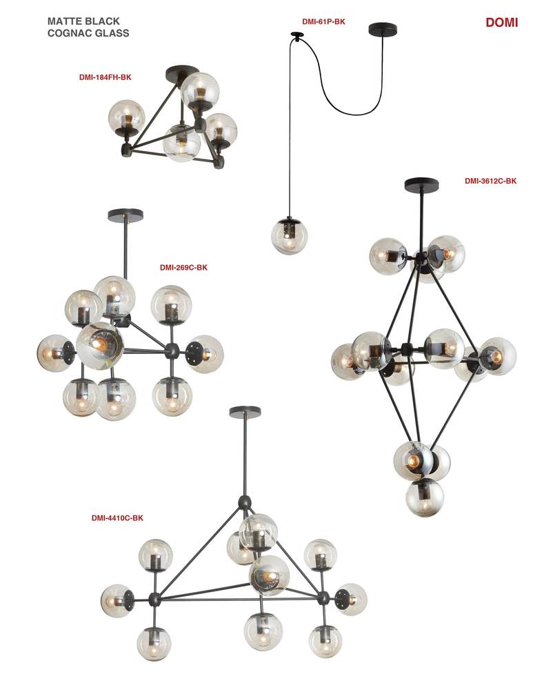 Domi chandelier lighting fascinates the eye with an ingenious design and artistic sense of composition. It draws attention with a geometric construction featuring strong lines offset by round lighting fixtures. The triangular base is crafted in metal with a matte black finish, warmly contrasted by round cognac glass globes that hold the lights. Despite the angular geometry, it creates a warm and welcoming illumination with a bold sensibility. The Domi chandelier is the perfect way to set a tone of unique style in a foyer/hall or great room, and will create a focal point in a modern dining room.