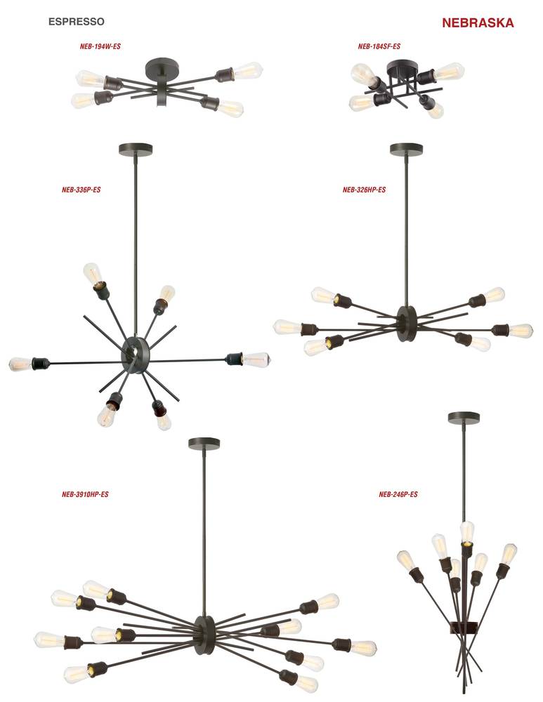 Adventurously stylish, the Nebraska family of lighting is inspired by the wide open spaces of the prairie state. The expansive design comes in a choice of configurations oriented vertically, horizontally or in all directions. A metal frame in a choice of gleaming finishes houses the arms that radiate out from the center. The bulbs emanate light from the end of each arm in a variety of intriguing patterns. With all its possible configurations, Nebraska lighting will add a focal point to any room from the living or great room to a dinette or hallway.