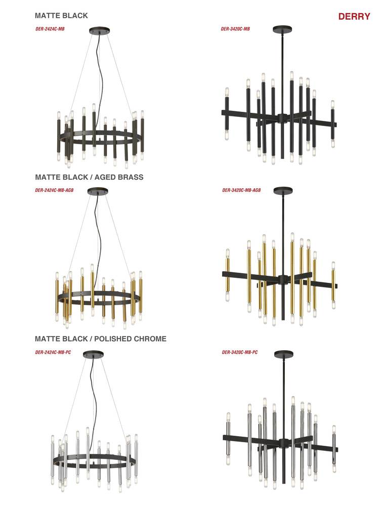 With strong lines in an artful design, the Derry family of chandelier lighting showcases your refined sense of style. Casting light both above and below, Derry lighting creates a welcome and reflective glow in the room. A simple linear metal frame in a fashionable black matte finish contrasts with the lights that glow at either end of vertical rods. The effect is modern, with a nod to traditional chandelier construction. Perfect for living or bedrooms, Derry lighting also adds a touch of artisan-style flair to an office setting.