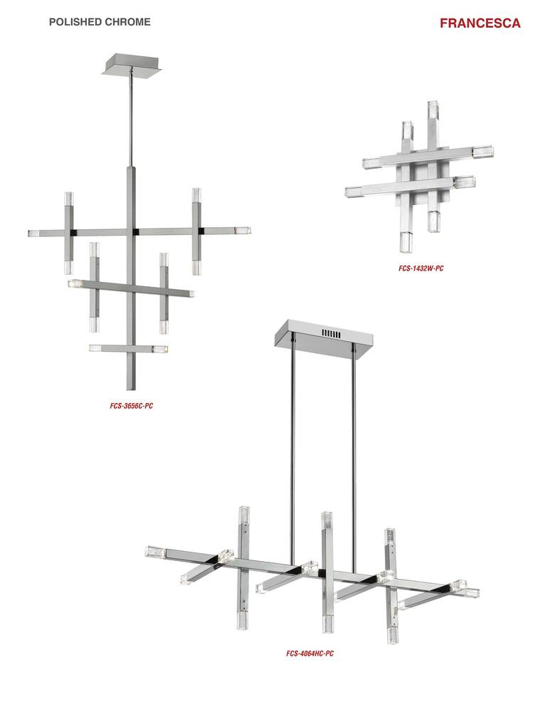 Intersecting lines and bold contrasts create the chic appeal of the Francesca family of lighting. With a nod to contemporary visual arts, the design comes in various configurations for chandeliers or wall lighting. The clever design is crafted with a metal base in a choice of finishes, based on the simple element of crossed bars. At the end of each bar, an LED with frosted acrylic diffusers create warm ambient light in all directions. Striking Francesca lighting is available in configurations to suit any area of your home from a hallway to the living and dining rooms.