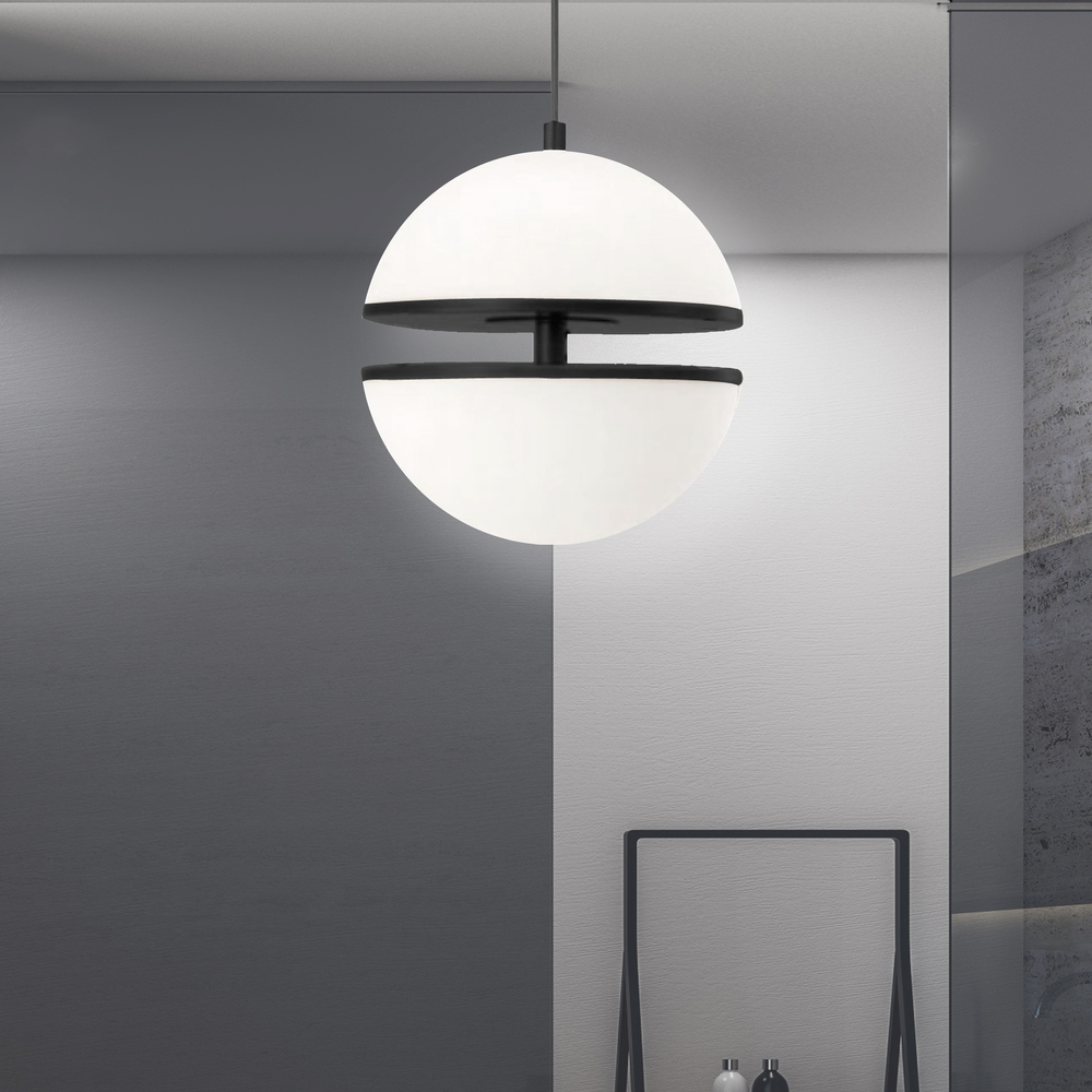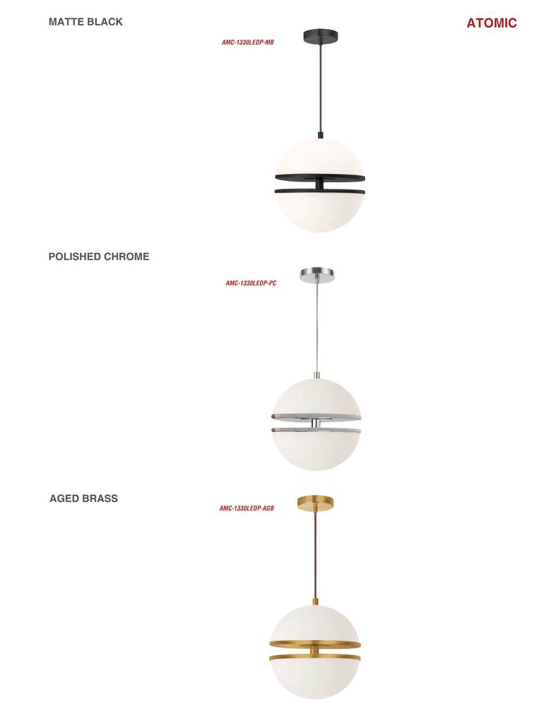 Inspired by the shapes of the cosmos, the Atomic family of lighting builds on the basic appeal of the sphere. An intriguing element of construction adds a focal point at the center of the design. A simple drop leads to a metal frame and a white glass globe with a separated upper and lower half. Lights shine from both halves. In one option, the frame in a contrasting color is visible at the mid-gap. In another option, a fabric shade in complementary or contrasting color rings the middle for a subtler glow of lighting. The stylish modern Atomic family of lighting will blend into your fashionable living or dining room, or main hallway.