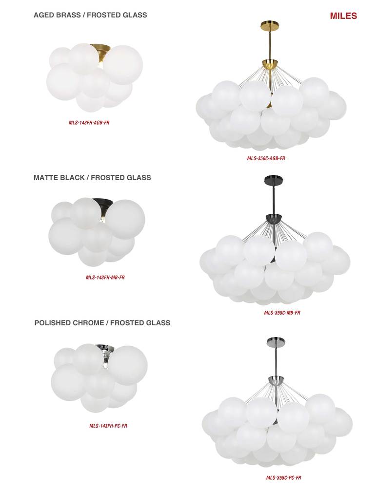 The Miles family of fixtures takes its inspiration from the buoyant appeal of balloons. Available in chandelier or flush mounted configurations, it's a funky take on contemporary designer style. The metal frame is rounded, creating a symmetrical design for either configuration. Light emanates in all directions from large globes, with a frosted finish for a skin-friendly glow. Miles lighting adds a bold stroke to contemporary décor schemes, and delightful curved lines to contrast minimalist furnishings. Its striking look is suitable for living rooms, bedrooms or an office setting.