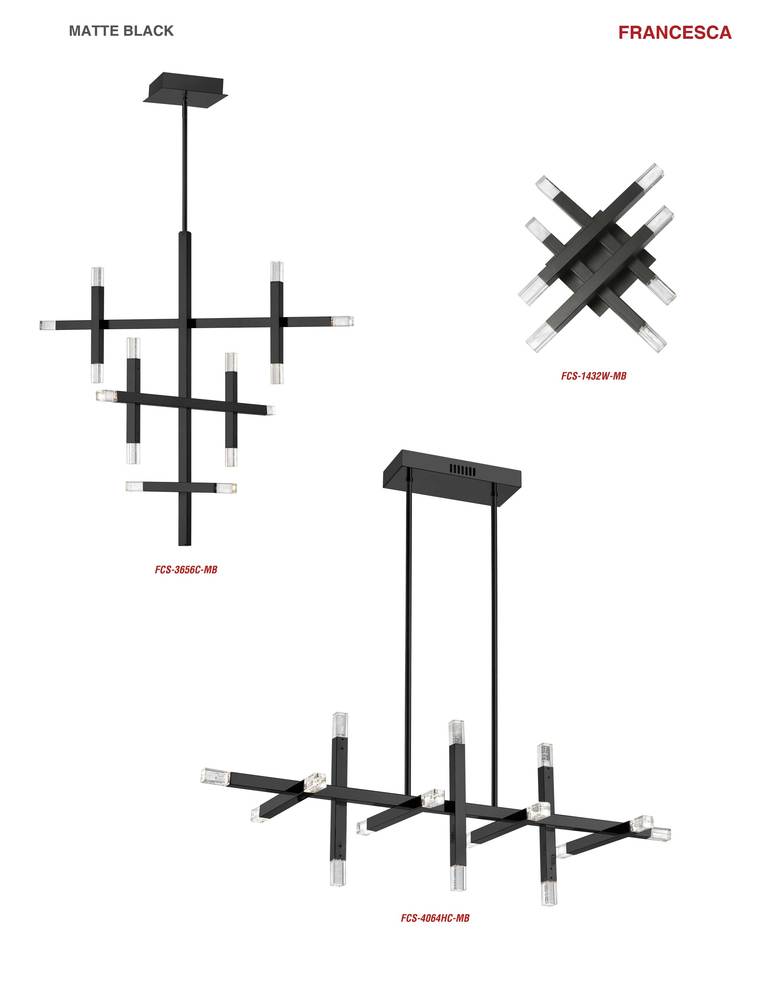 Intersecting lines and bold contrasts create the chic appeal of the Francesca family of lighting. With a nod to contemporary visual arts, the design comes in various configurations for chandeliers or wall lighting. The clever design is crafted with a metal base in a choice of finishes, based on the simple element of crossed bars. At the end of each bar, an LED with frosted acrylic diffusers create warm ambient light in all directions. Striking Francesca lighting is available in configurations to suit any area of your home from a hallway to the living and dining rooms.