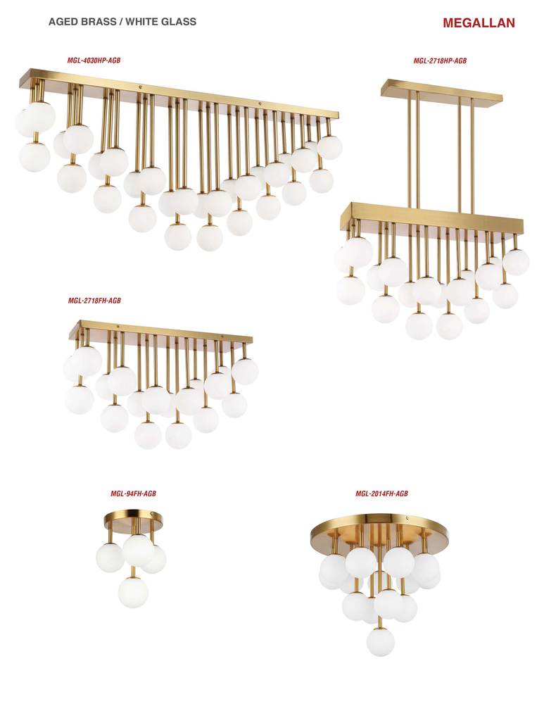 Beautifully bright and full of curvy movement, the Megallan family of lighting will become a focal point of any space where it's installed. The design features variations on the theme of hanging glass globes for a look that's elegant and eye-catching. The metal base comes in various configurations, and choice of polished chrome, aged brass, or matte black finish depending on the format. With either horizontal or symmetrical options, Megallan lighting will draw attention to your furnishings in a modern or contemporary décor. Opal glass creates a subtle reflection of light, with options that will suit living and dining rooms, as well as the main entrance or hallway of your home.