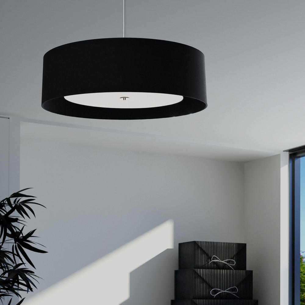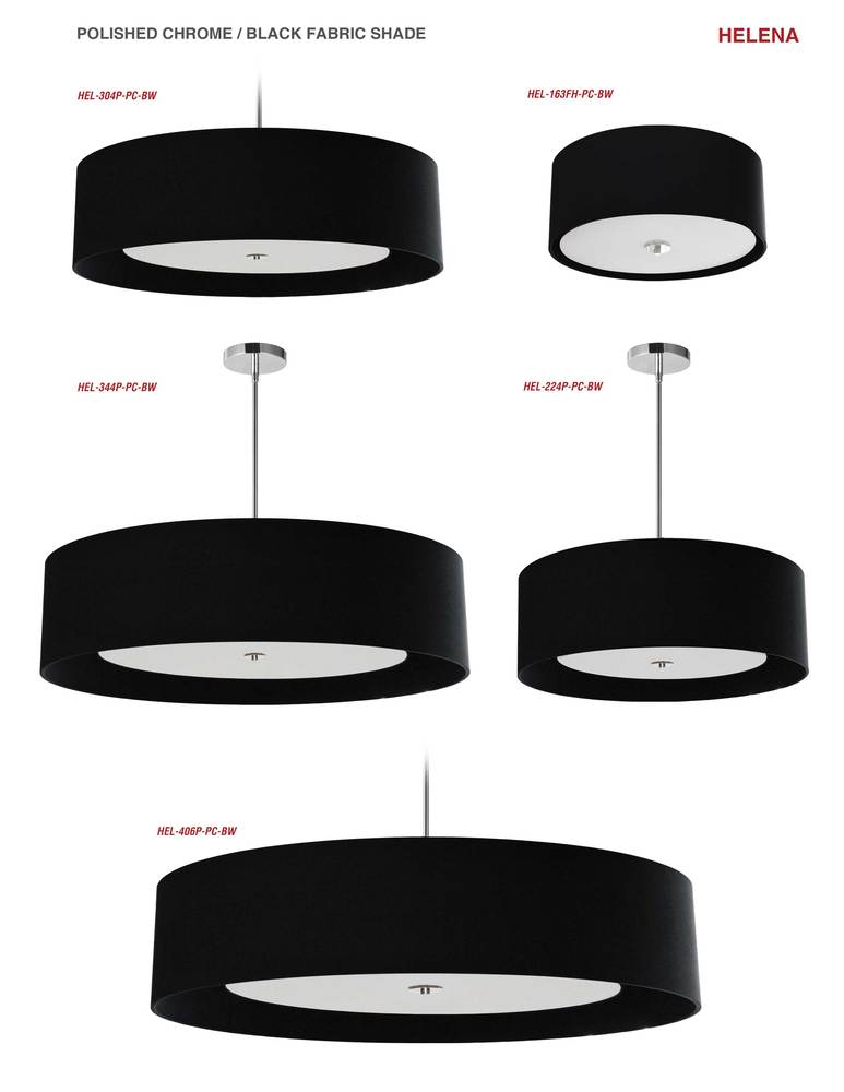 The eye is drawn to the polished minimalism of the Helena family of lighting. The effect is subtle and stylish, making a statement in luxury for discerning tastes. A minimalist frame in metal with a polished chrome finish is overshadowed by a large drum-style fabric shade in your choice of color. Inside the shade, a white fabric diffuser creates softer, skin-friendly lighting. The look can be set flush to the ceiling for an even more understated effect. Helena lighting adds a fashionable note to your foyer or dining room area, without taking the spotlight away from your overall décor scheme.