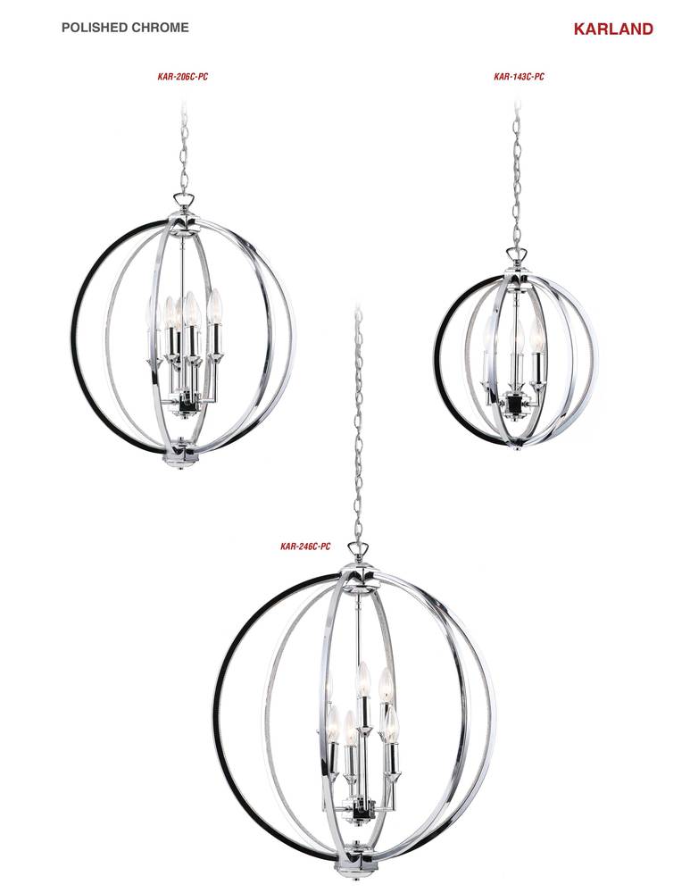 It's the details that make the design, and that's apparent in the Karland family of lighting. The simple appeal of the circle is the base for an appealing line of lighting with a timeless and pretty look. A chain drop suspends the metal frame, a rounded cage created with three open circles in a gleaming polished chrome finish. Within that modern construction, a cluster of lights are set in a housing inspired by traditional candle sconces. Shimmering crystals stud the inside of each band, reflecting and amplifying the light. You'll add a decidedly romantic and artistic touch to any dining room, and a welcoming glow to your foyer or main hall.